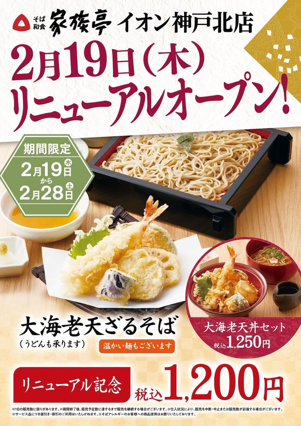 今回のリニューアルオープンを記念して、「家族亭 イオン神戸北店」のみ期間限定で特別メニュー「大海老天ざるそば」を1,200円(税込)、「大海老天丼セット」を1,250円(税込)で販売いたします。