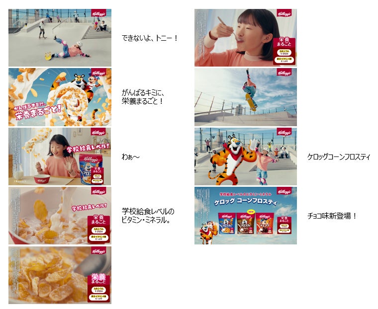 ケロッグのコーンフロスティのCMでは、1980年代より、トニー・ザ・タイガーが様々なことに挑戦する子どもたちを応援する存在として親しまれてきました。これまでも、頑張って自分に打ち勝とうと挑戦する子どもたちが、もう一息のパワーを必要とする場面でトニー・ザ・タイガーが登場し、ケロッグの「コーンフロスティ」を食べることで力がみなぎっていく、というストーリーを描いてきました。本CMでは、失敗を重ねながらもスケートボードに挑み続ける子どもの前にトニー・ザ・タイガーが登場し、ケロッグの製品を食べることでパワーがみなぎった子どもが、自身の目標を達成していく様子が描かれています。ポジティブなメッセージが込められており、子どもたちの成長を応援する内容となっています。