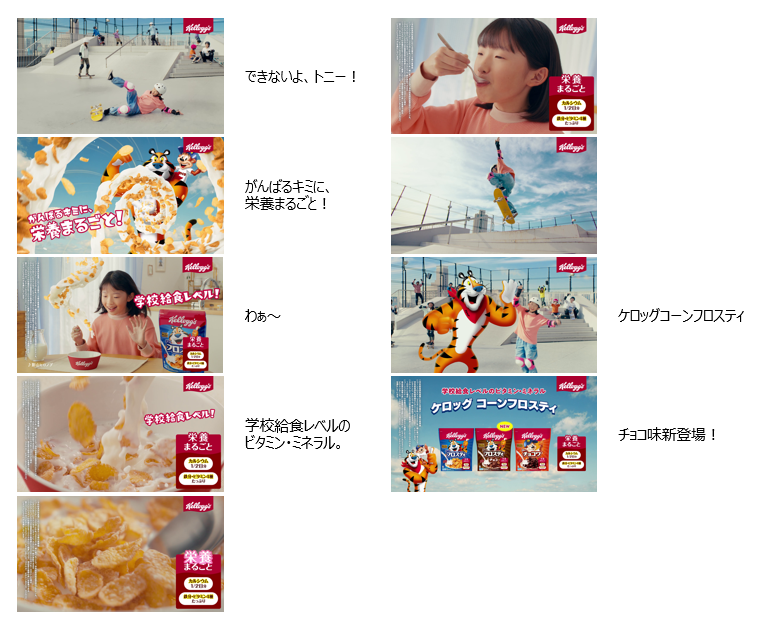 ケロッグのコーンフロスティのCMでは、1980年代より、トニー・ザ・タイガーが様々なことに挑戦する子どもたちを応援する存在として親しまれてきました。これまでも、頑張って自分に打ち勝とうと挑戦する子どもたちが、もう一息のパワーを必要とする場面でトニー・ザ・タイガーが登場し、ケロッグの「コーンフロスティ」を食べることで力がみなぎっていく、というストーリーを描いてきました。本CMでは、失敗を重ねながらもスケートボードに挑み続ける子どもの前にトニー・ザ・タイガーが登場し、ケロッグの製品を食べることでパワーがみなぎった子どもが、自身の目標を達成していく様子が描かれています。ポジティブなメッセージが込められており、子どもたちの成長を応援する内容となっています。