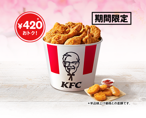 KFC自慢の「オリジナルチキン」と「ナゲット」をたっぷり楽しめる「ひなまつりバーレル」は、通常価格※2より420円もおトク! テーブルを囲んで、家族や大切な人と会話を弾ませながら、おいしいひとときをお過ごしいただけます。