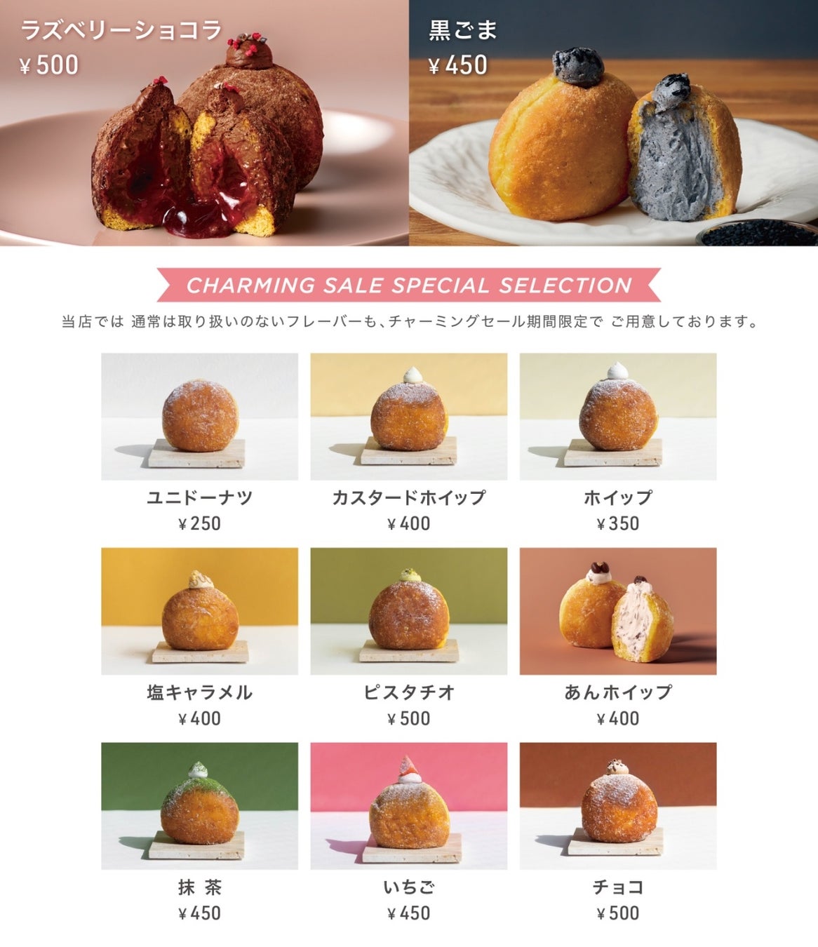 生地にカボチャを使用し、ひと口ごとに広がるやさしい甘さと、ふんわりとろける「生食感」が人気の生ドーナツ。今回は、期間限定フレーバー〈ラズベリーショコラ〉〈黒ごま〉のほか、普段店頭での取り扱いがない〈いちご〉〈抹茶〉〈塩キャラメル〉〈ピスタチオ〉〈あんホイップ〉を加えた、全11種をご用意しております。