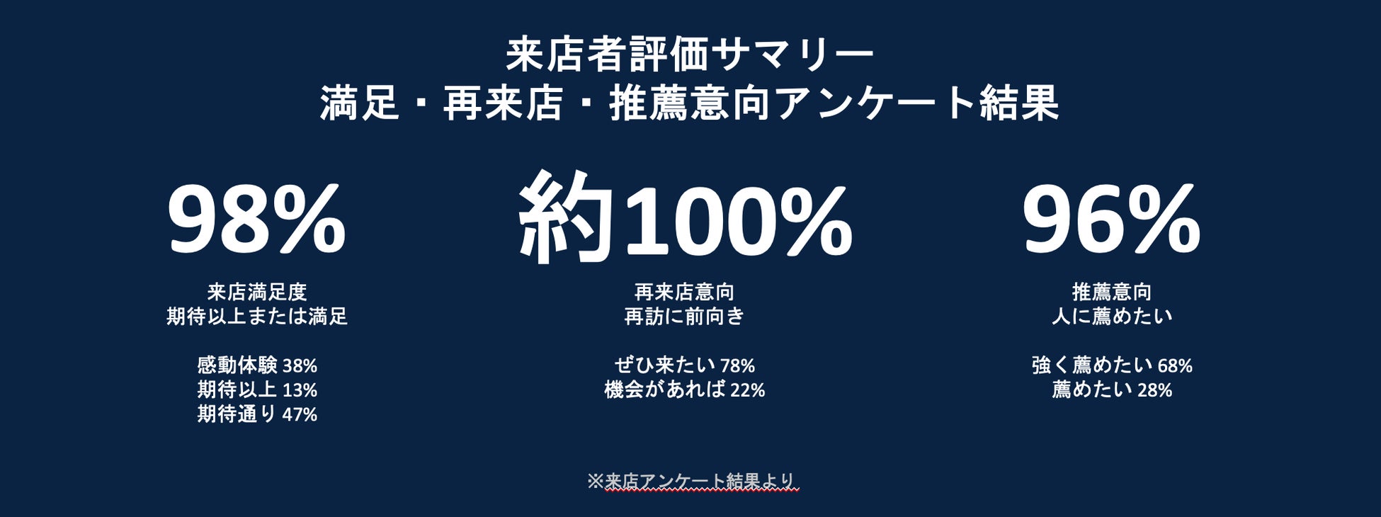 オープン1ヶ月を機に実施している顧客アンケート(回答数537名超)では、驚異的な満足度を記録しています。