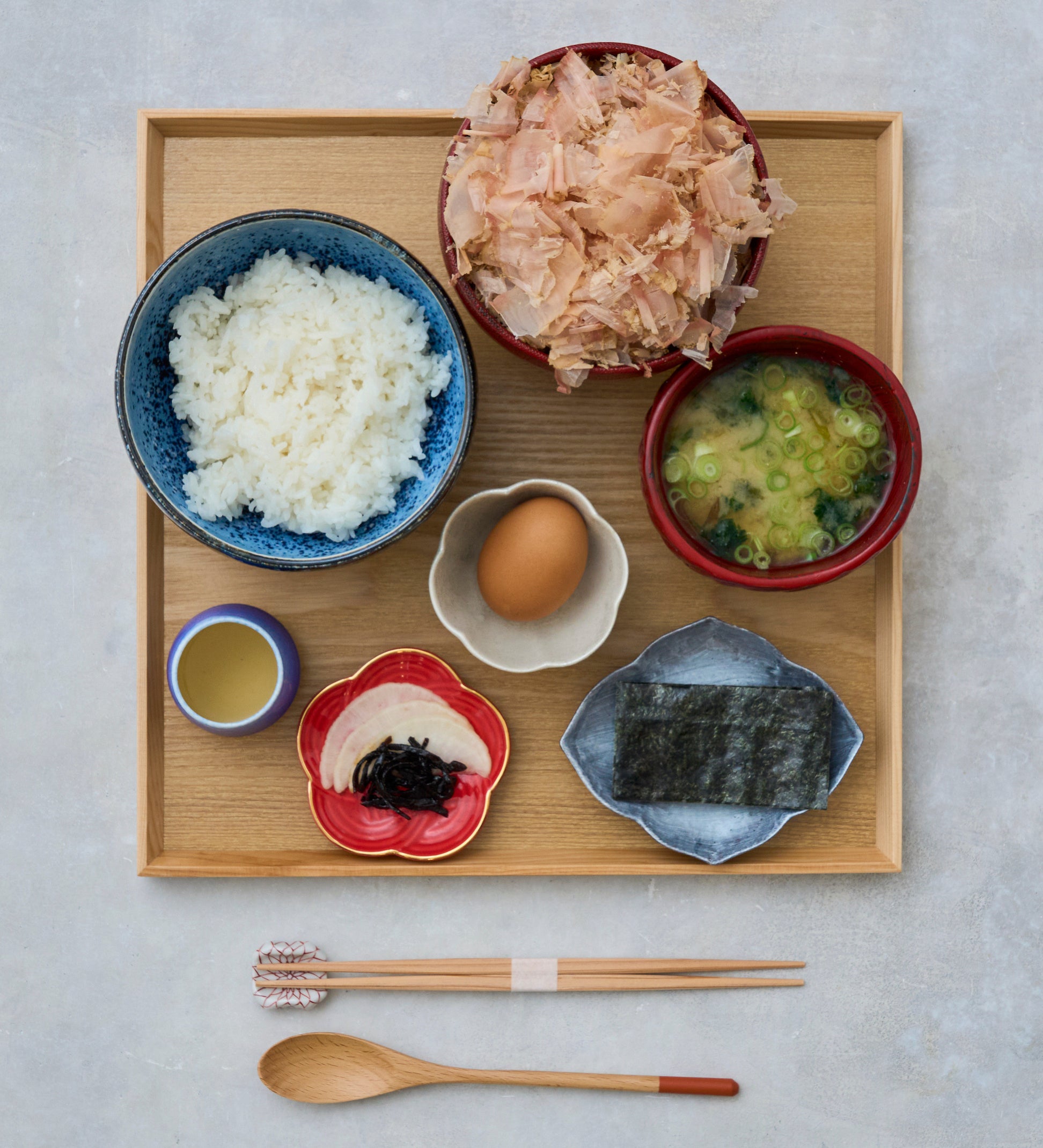 ごはん、⽣削り鰹節、夢王、味噌汁、⾹の物2種、焼き海苔がセットとなった基本メニューとなります。