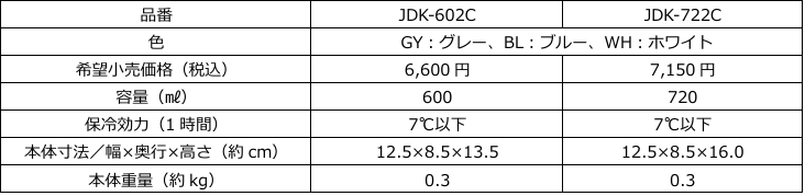 『真空断熱ジョッキ(JDK-602C/722C)』 仕様一覧