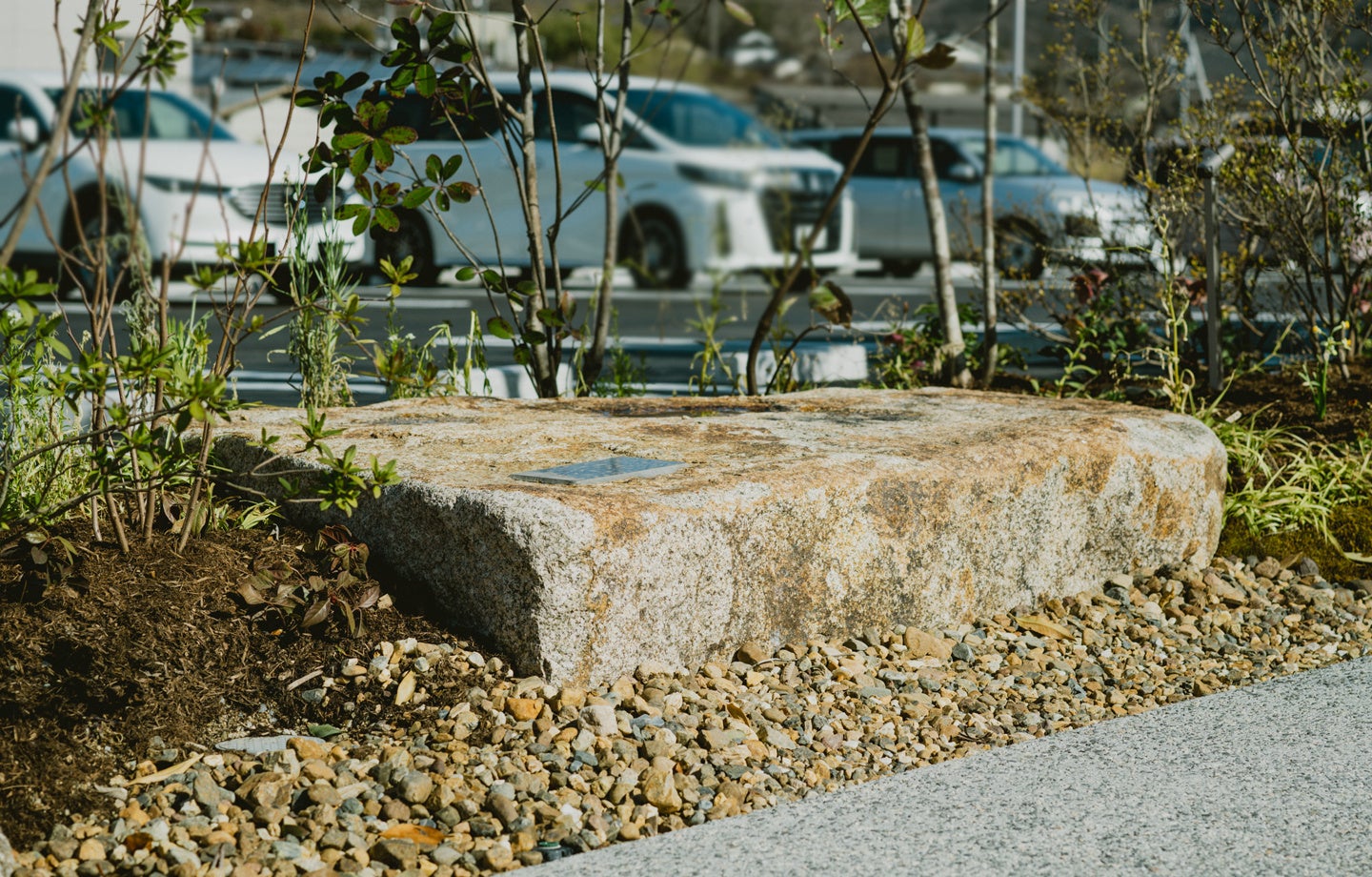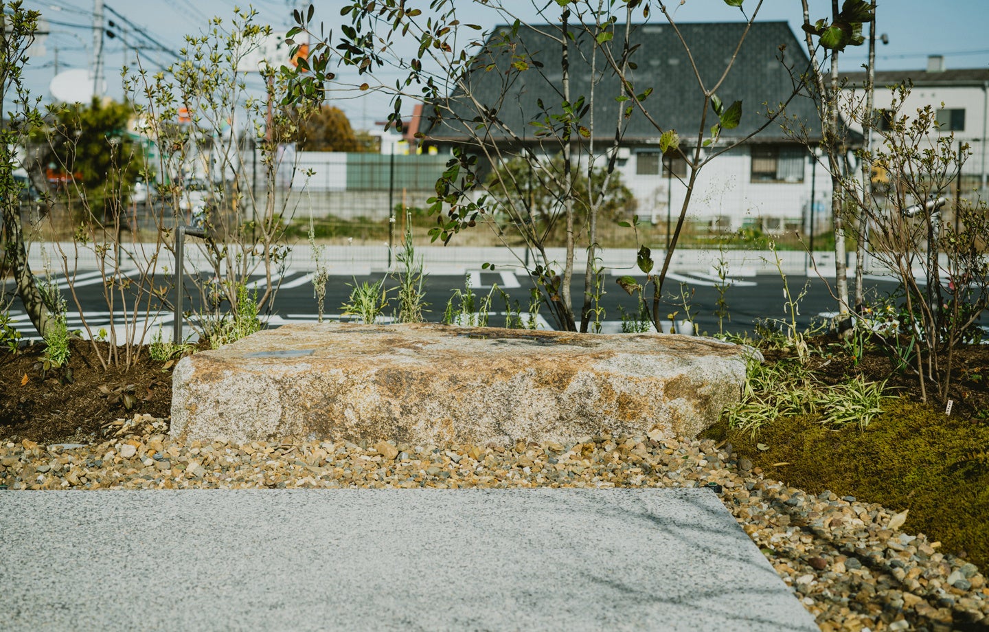石のパーゴラは、人が集い、留まり、時間を過ごす場をあえて“石”という動かない素材で構成するという思想のもと設計されました。