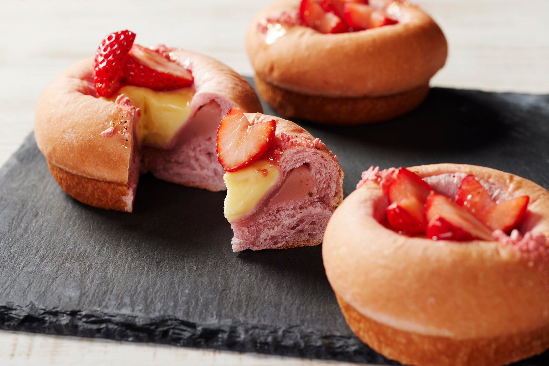 桜色に仕上げた生地に、桜あんとカスタードを重ね、いちごと桜チップをトッピング。いちごの程よい酸味と、見た目にも春らしい可愛らしさが印象的な一品です。