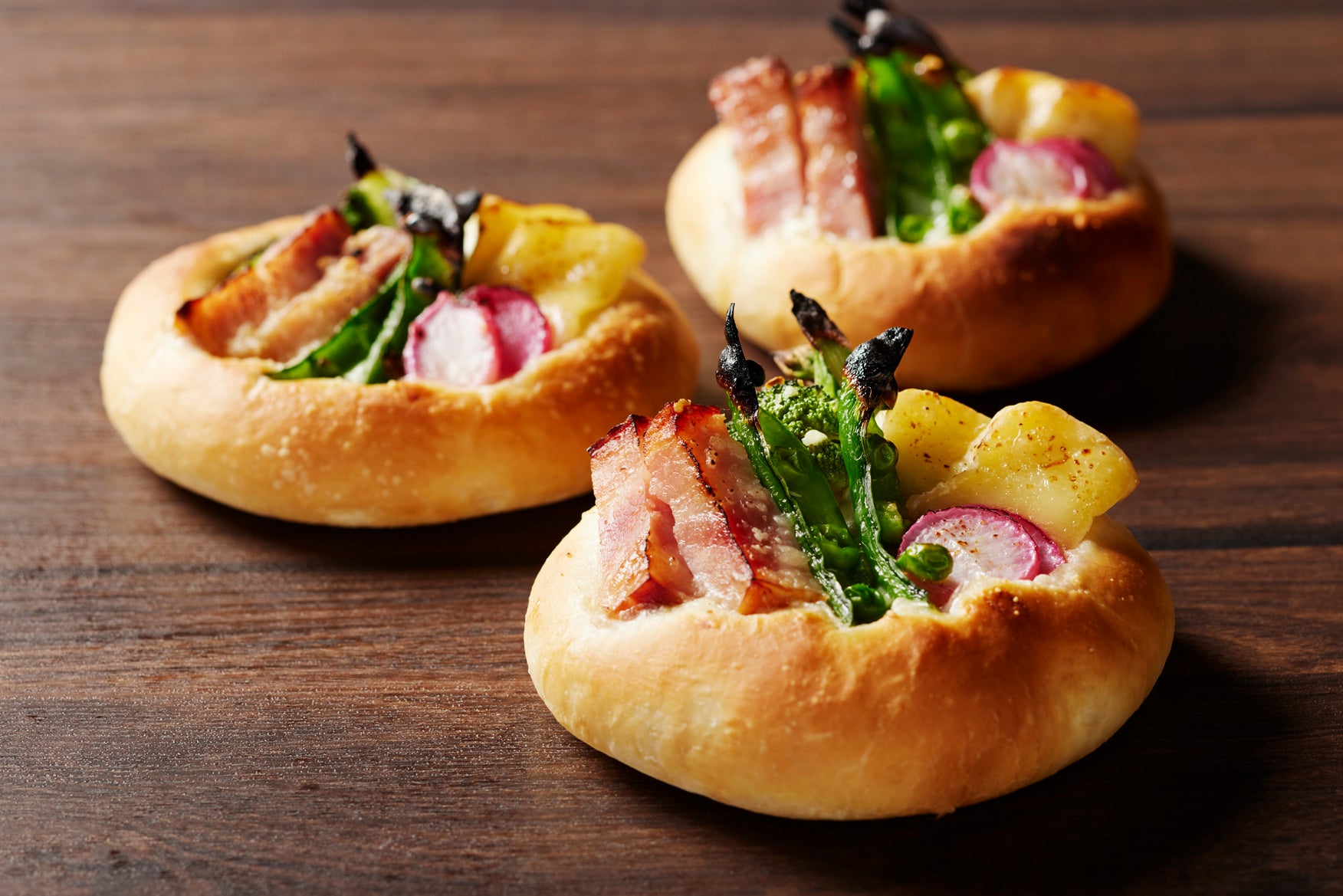 厚切りベーコンとカマンベールチーズに、アスパラガス、ブロッコリー、スナップエンドウ、ラディッシュを合わせました。