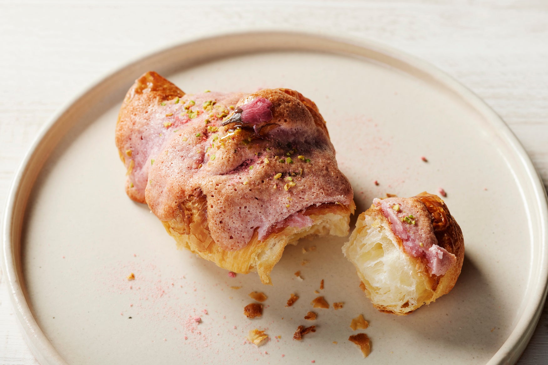 桜色のメレンゲをのせたクロワッサンに、桜の塩漬けと桜チップをトッピング。サクサクとした食感とともに、口いっぱいに桜の香りが広がる、春限定のクロワッサンです。