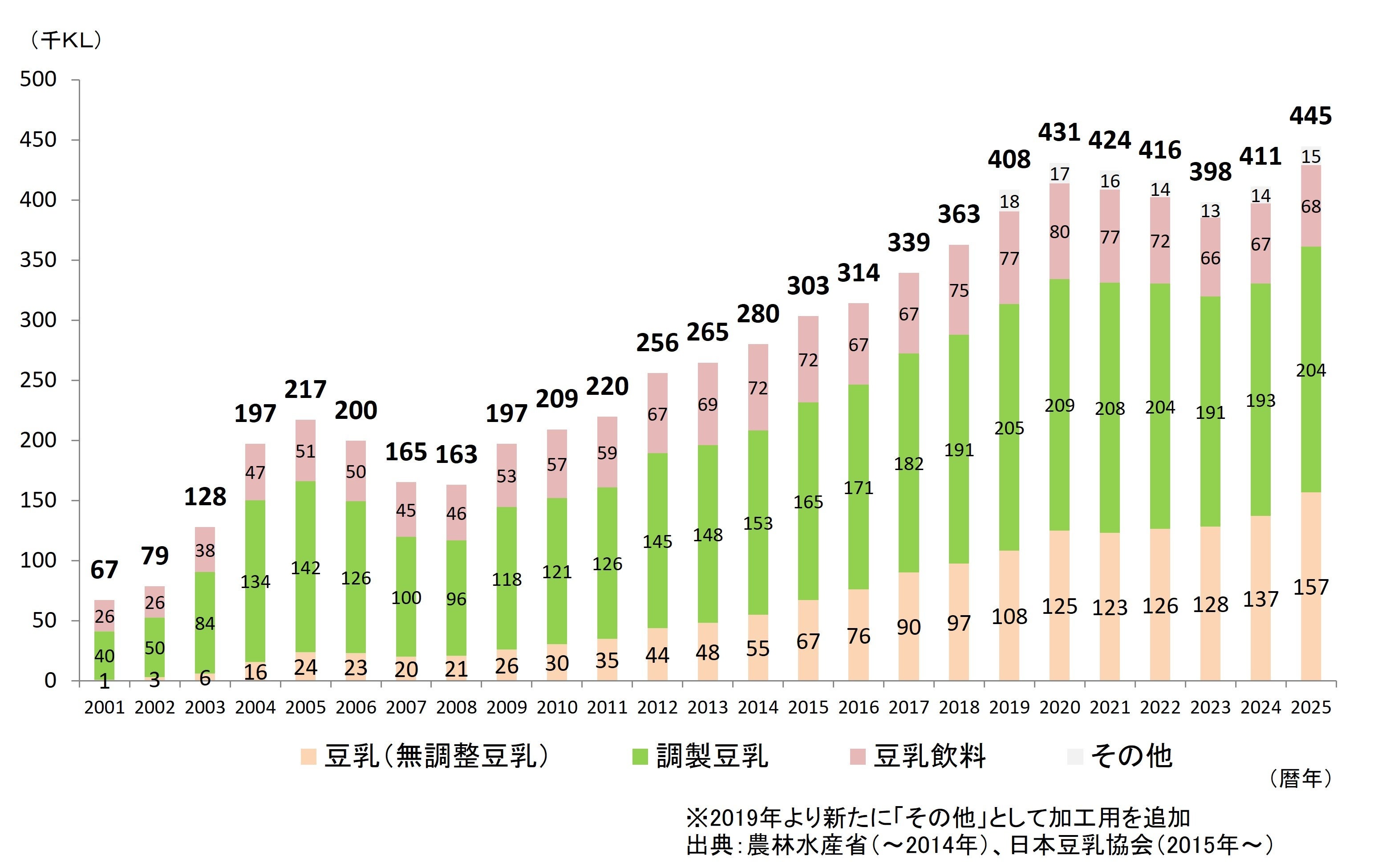 2025年の豆乳の国内生産量は、過去最高の44.5万KLでした。