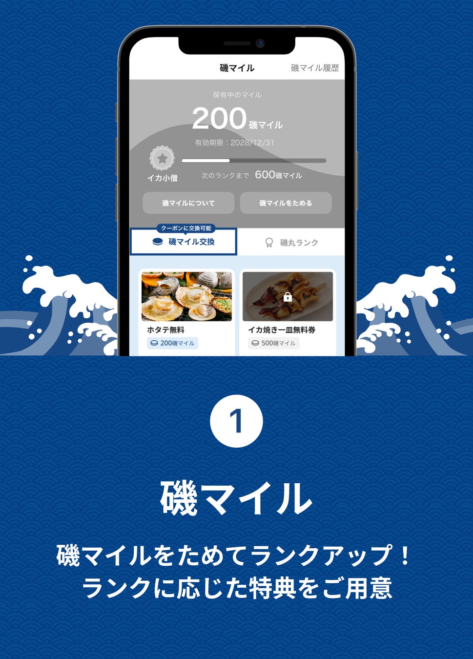 本アプリは、モバイルオーダーと連動した「磯マイル」や、毎日楽しめる「釣りゲーム」など、磯丸水産での体験をより「楽しく」「お得に」アップデートするコンテンツが満載です。