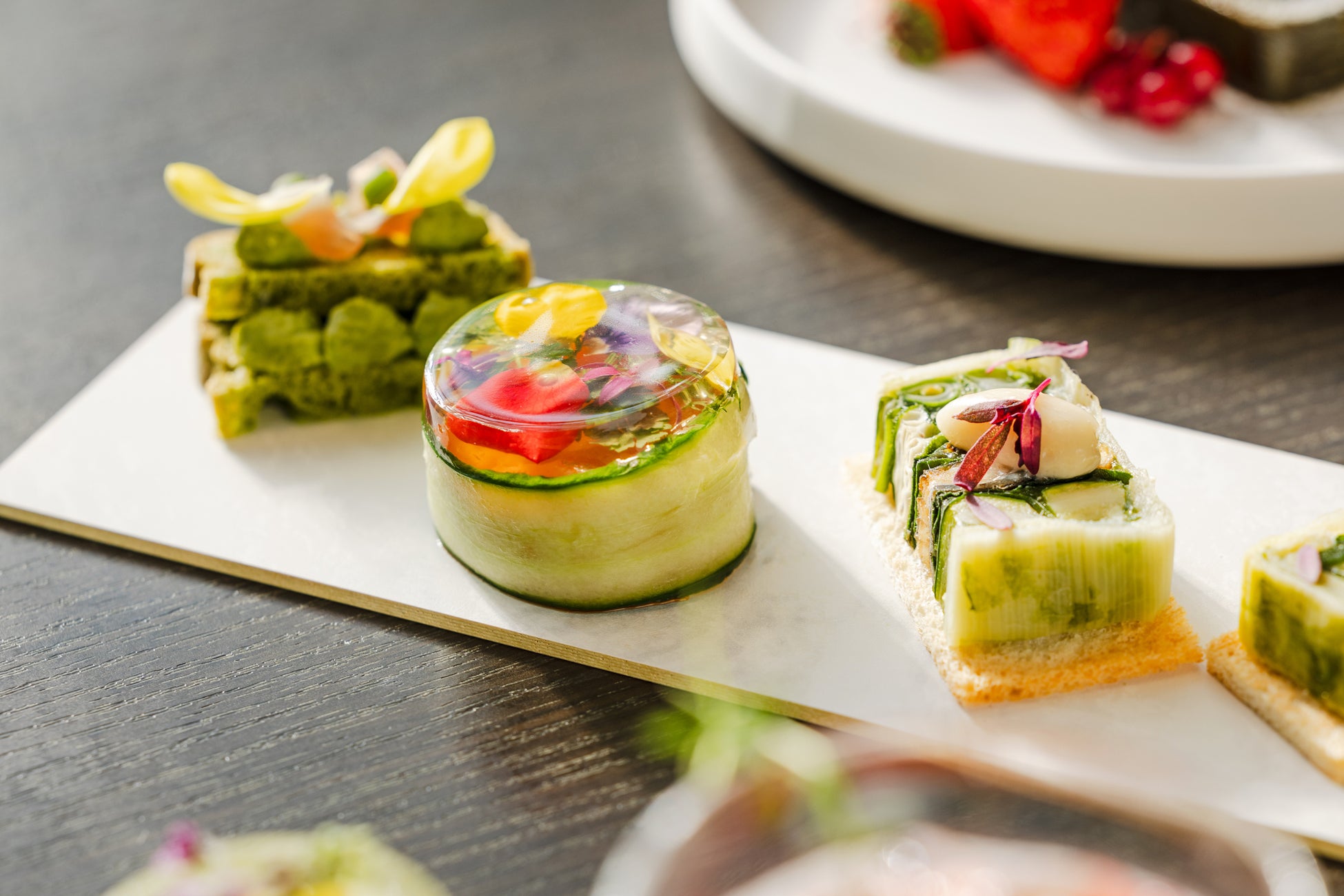 香り高い抹茶のコクと、とろける口どけのテリーヌやブリュレを主役に、サクッともちっとした多彩な食感のスイーツを合わせ、ひと口ごとに心までほどける“しあわせ食感”が楽しめます。旬野菜の旨味を凝縮したプレッセなどのセイボリーは、香ばしさと軽やかさの絶妙なバランス。スペシャリテ「とろける抹茶テリーヌショコラ」は、濃厚な抹茶の風味となめらかな生食感に、桜とベリーのソースを添えた、ひと皿で二度美味しい、シェフこだわりのひと皿。
