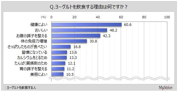 ヨーグルトを飲食する理由は「健康によい」が飲食者の6割、「おいしい」が5割弱、「お腹の調子を整える」4割強、「体の免疫力増強」3割強