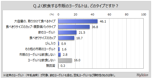 よく飲食するヨーグルトのタイプは(複数回答)、「大容量の、取り分けて食べるタイプ」が46.1%、「食べきりサイズのカップ・複数個パックタイプ」が36.8%、「飲むヨーグルト」「食べきりサイズのカップ」が2割前後です。