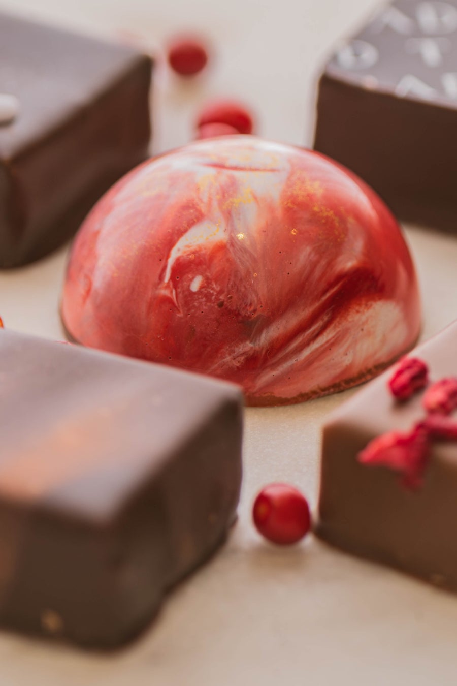 モルトンブラウンのフレグランス「ピンクペッパー」にインスパイアされたTIADオリジナルの限定ショコラ(写真中央)。ピンクペッパーを練りこんだラズベリーとライチのコンフィチュール、ジンジャーとラズベリー、苺のガナッシュクリームを使った一粒は、カカオの芳醇な香り、ラズベリーの甘酸っぱさとライチのエキゾチックな香りが口の中に広がります。さらにジンジャーの爽やかな辛みがラズベリーと苺の甘酸っぱさを引き立て、全体に奥行きを与える、甘みと酸味のバランスがとれた「軽やかな甘さ」を演出した一粒です。