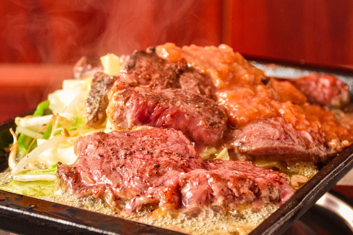 厳選されたリブロースを使用した「ジューシーステーキ」は、『ステーキロッヂ』を代表する看板メニューです。適度な脂がぎゅっと詰まったリブロースは、口の中でとろけるような食感と、コク深い旨みが特徴。自分好みの焼き加減を楽しめる『ステーキロッヂ』独自のスタイルも魅力です。蓄熱性の高いオリジナル鉄板の上で、レアの状態から提供するため、熱々の鉄板の余熱を利用し、お好みの焼き加減に調整できます。