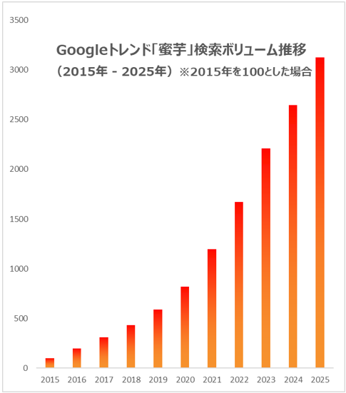 近年、「しっとり」 「ねっとり」 としたタイプのさつまいもがスイーツとして食べられるようになり、さつまいもの通年需要が拡大しています。特に「蜜芋」の人気は高く、 Googleトレンドでは、2015年からの10年間で「蜜芋」の検索ボリュームは約31倍に拡大し、特に2023年以降のトレンドが顕著になっています。和菓子・冷菓・菓子・生菓子など幅広いジャンルで、「蜜芋」関連商品が続々と新発売されています。