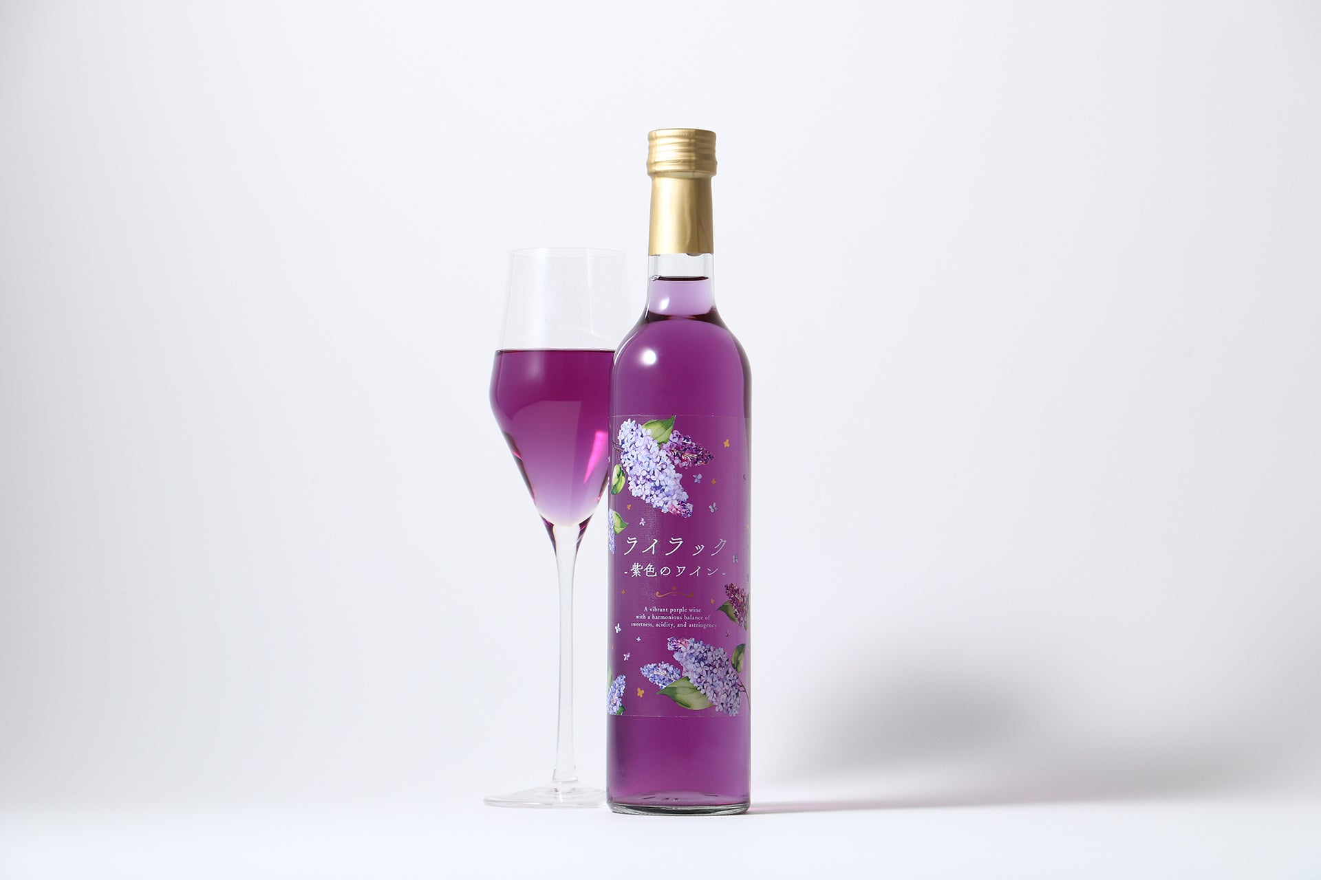 「ライラック -紫色のワイン-」は、ライラックの上品でロマンチックな姿をイメージして誕生したワインです。白ワインと、人気のハーブ「バタフライピー(チョウマメ)」を合わせることで透き通るような美しい紫色を実現しました。バタフライピー本来の青色が白ワインの酸に反応することで、自然由来の素材のみでこの華やかな色彩を表現しました。美しい紫色の液色とともに、白ワインらしい爽快な飲み心地を両立した1本です。