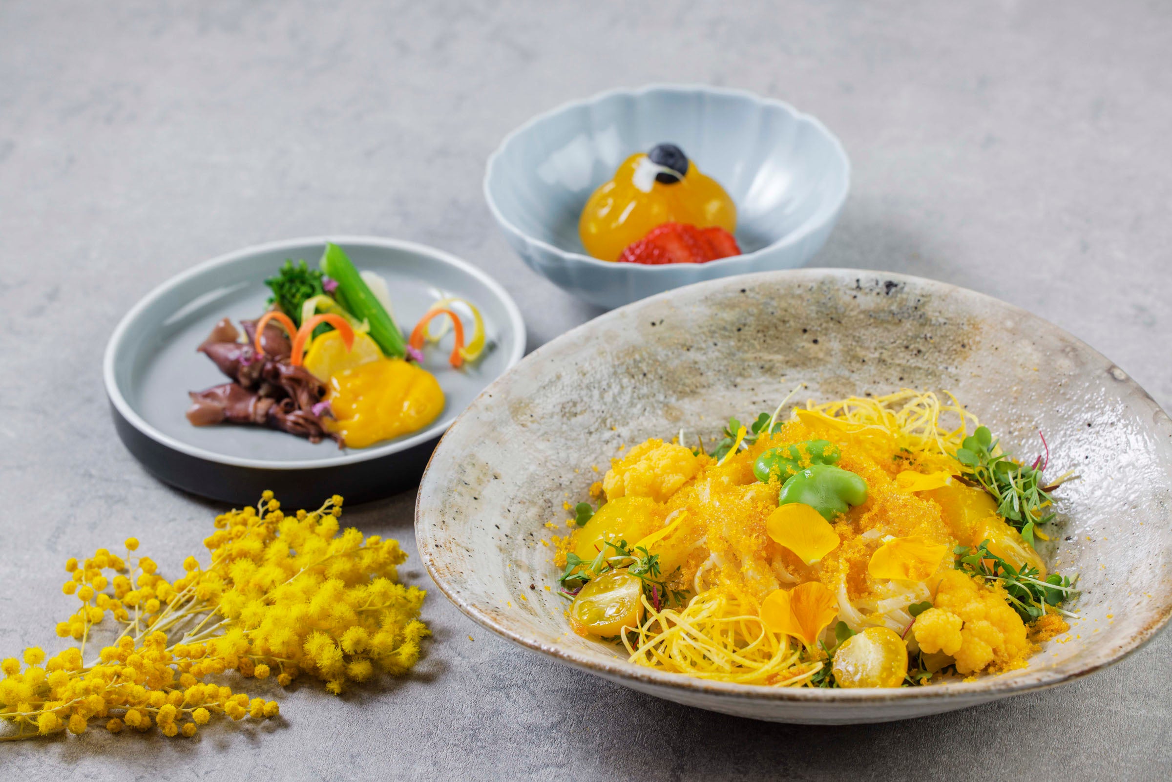 シンボルカラーであるイエローを主役に、季節の恵みを取り入れた特別なセットメニューをランチタイムにてご提供。先付けには、蛍烏賊と春野菜を黄身酢で和え、菜の花やうるい、黄ズッキーニの瑞々しい彩りを添えて。お食事には、からすみの旨みととびこの食感、黄色野菜の爽やかさを生かした冷たいサラダうどんをご用意します。締めくくりは、マンゴーと白餡を包んだ葛まんじゅうを。春の訪れと前向きなエネルギーを感じる、やさしく華やかなひとときをお楽しみいただけます。