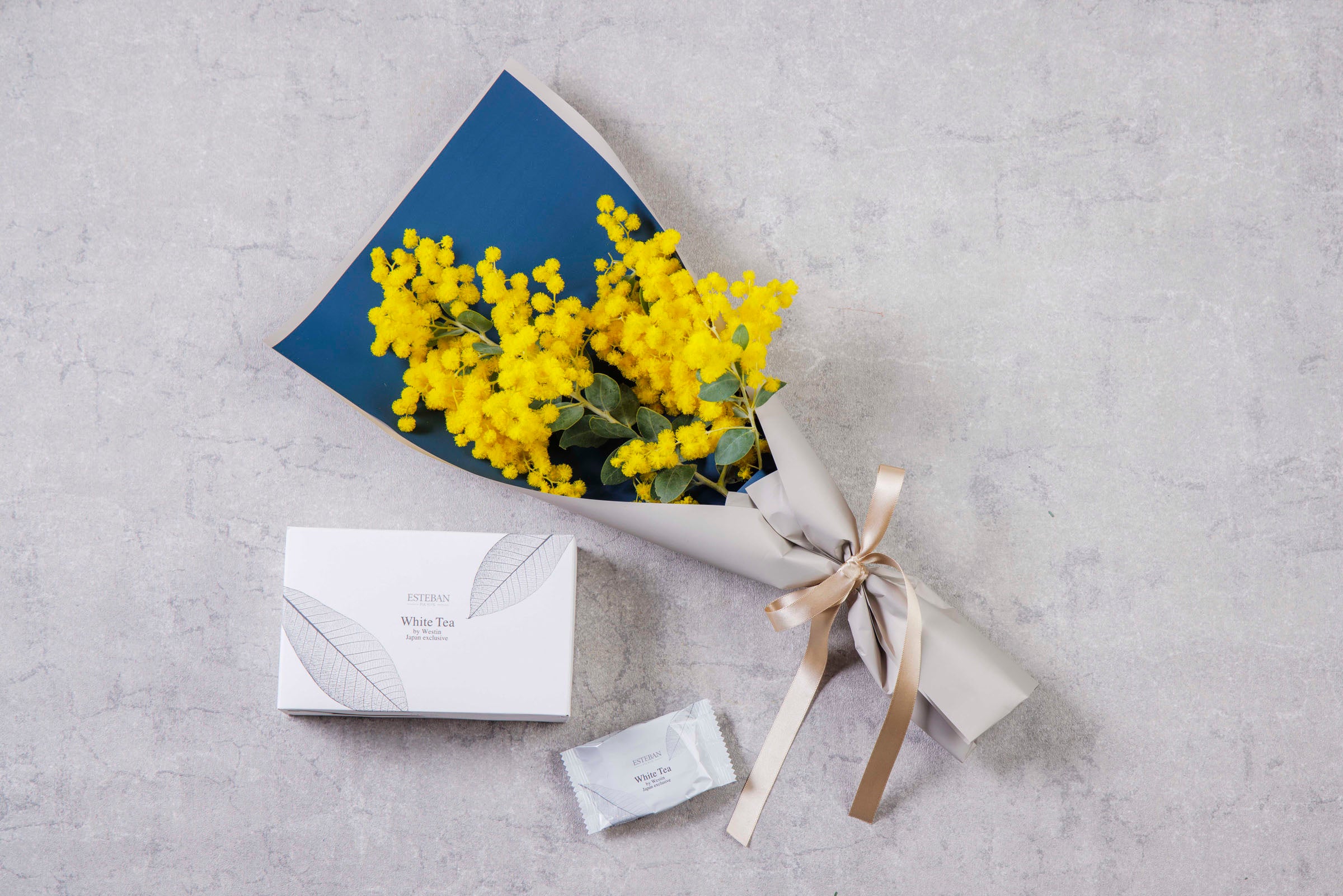 フラワーショップ「+F」の鮮やかな色合いのミモザのブーケと、ホワイトティーバスタブレットのギフトセットをご用意いたします。お肌にうるおいを与える植物由来成分ホホバオイル&ローズヒップエキスが含まれており、ご自宅でも心地よく洗練された魅惑的な香りに包まれる癒しのバスタイムをお過ごしいただける嬉しいセットです。