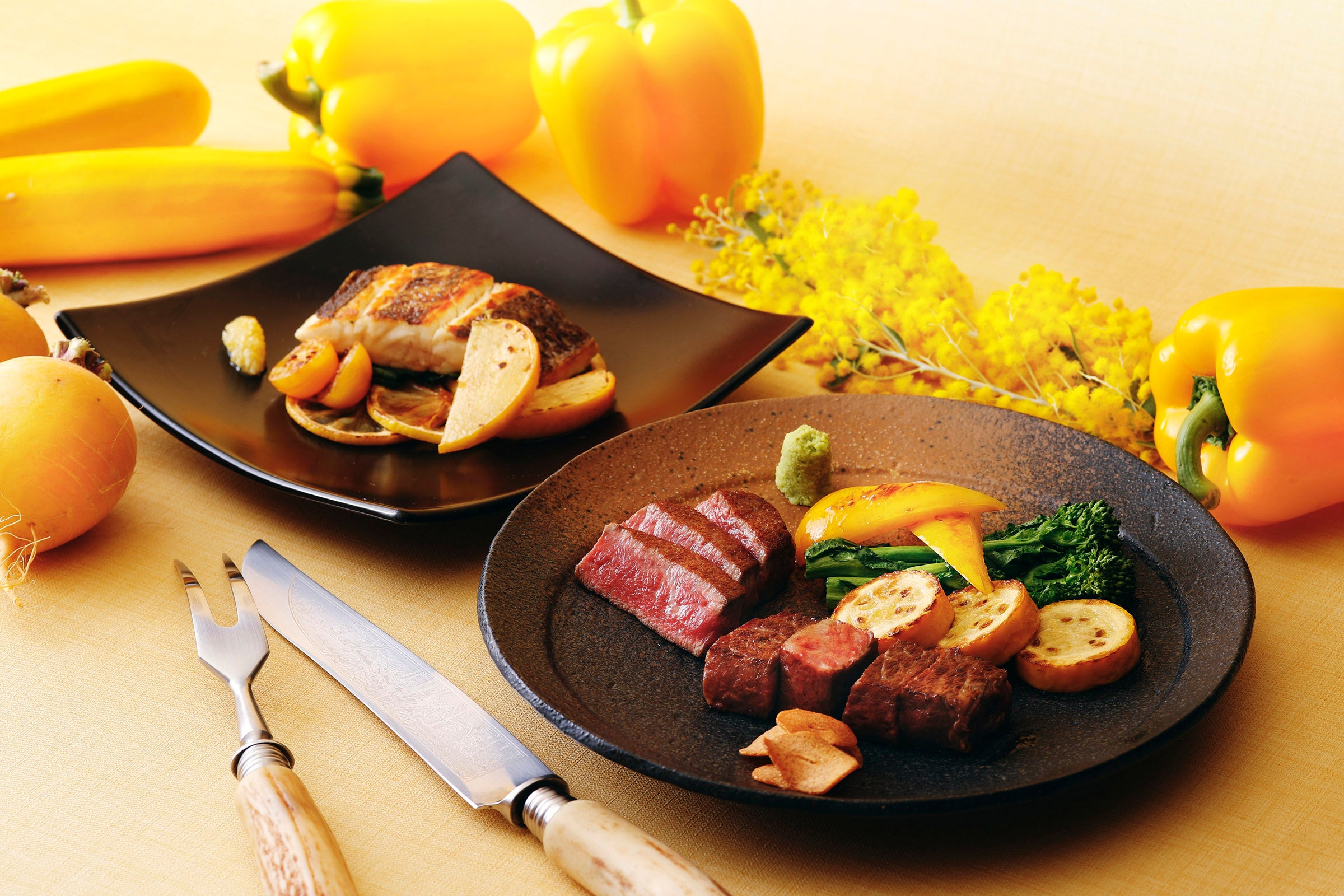 ・恵比寿牛フィレとロースの食べ比べ 黄色の焼き野菜添え