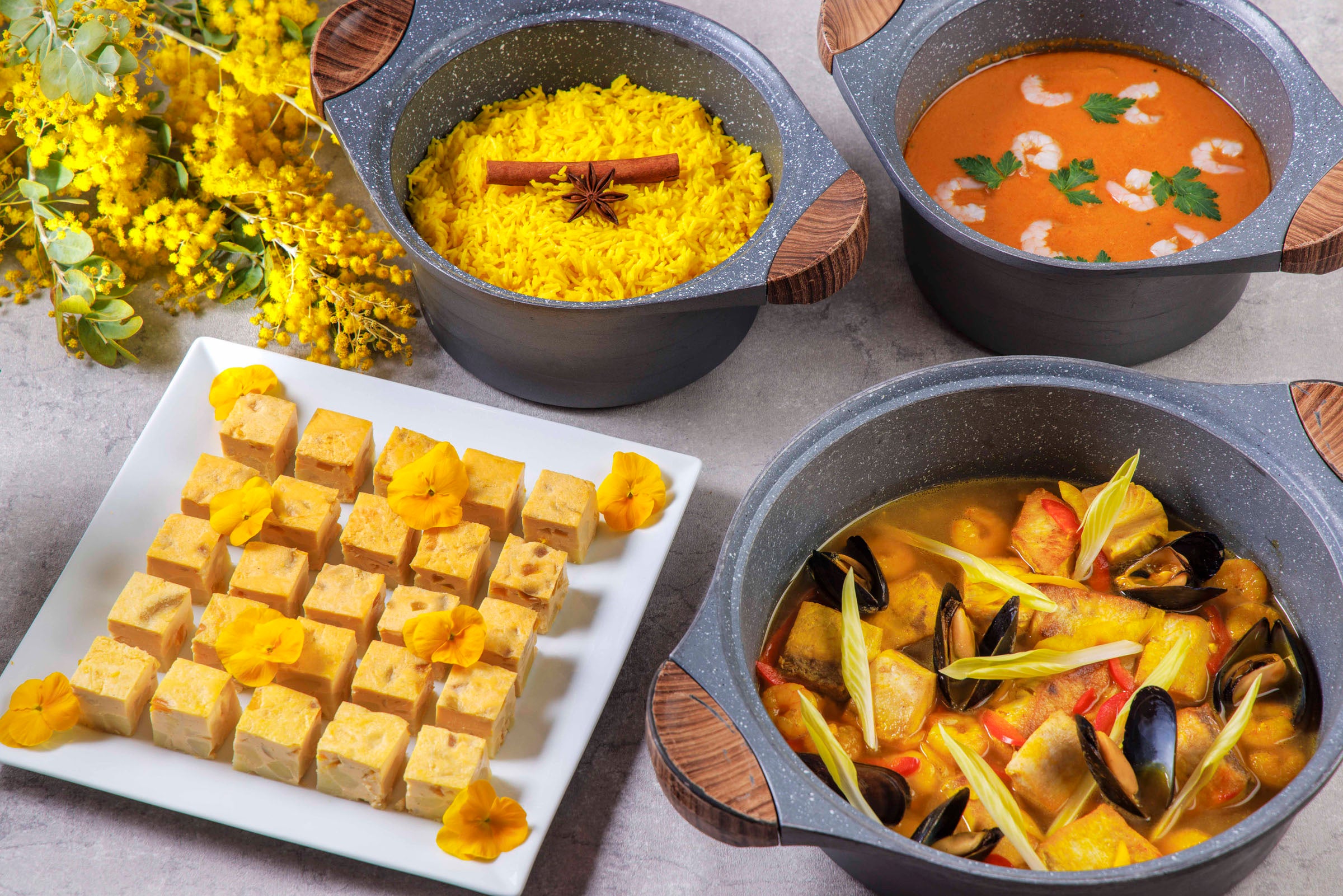 「ザ・テラス」のイノベーションブッフェでは、3月限定で「Happy Yellow」をテーマにしたスペシャルメニューをご用意します。ほくほく食感が楽しめる「タマネギとジャガイモのスペイン風オムレツ」、サフランの香りと魚介の旨みが溶け合う「ブイヤベース サフラン風味」、そしてサフランライスとともに楽しむ「イエローシュリンプカレー」など、イエローの色彩とスパイスの香りが食欲をそそる、心まで明るくなる華やかなお料理をご提供します。