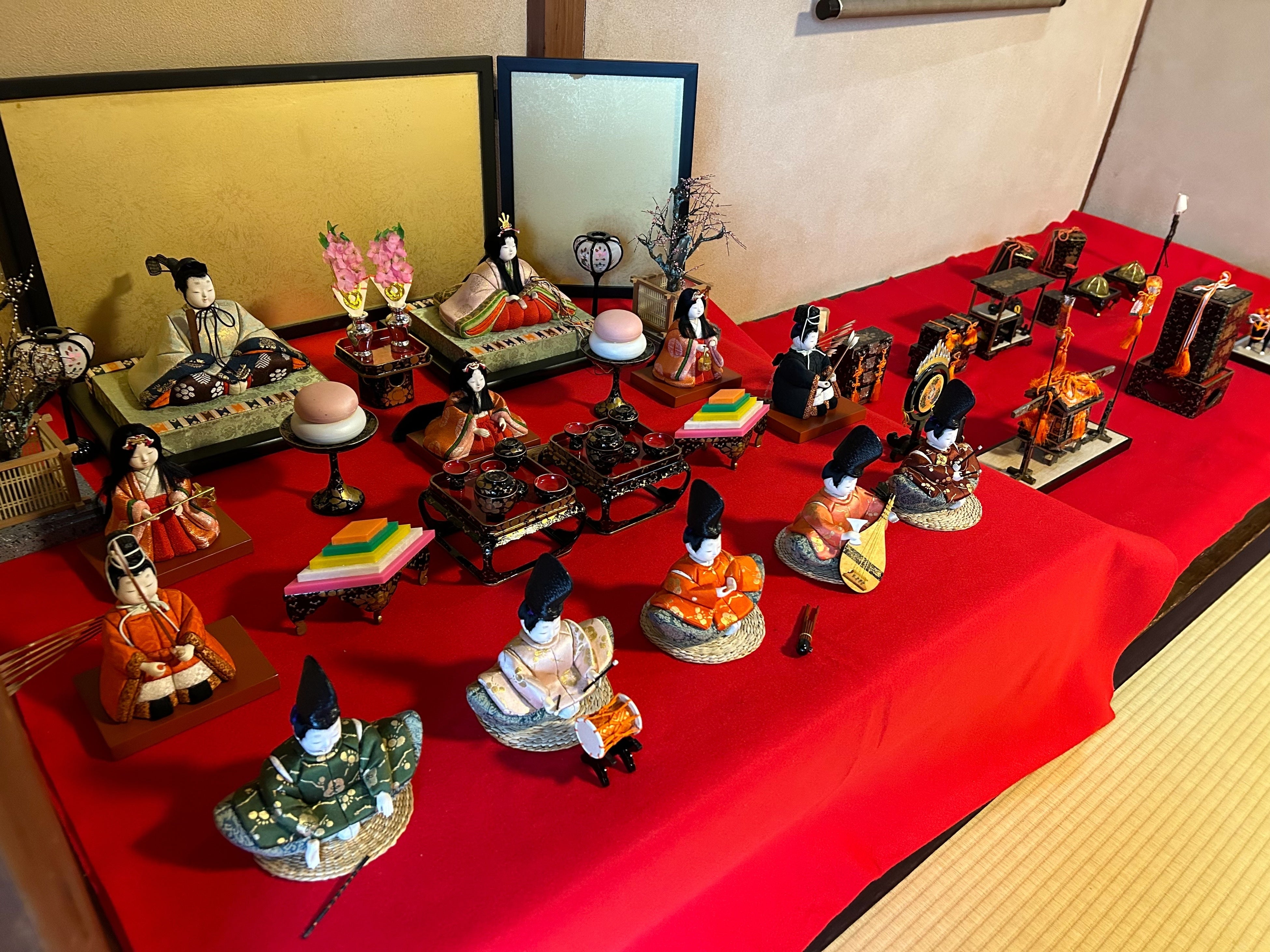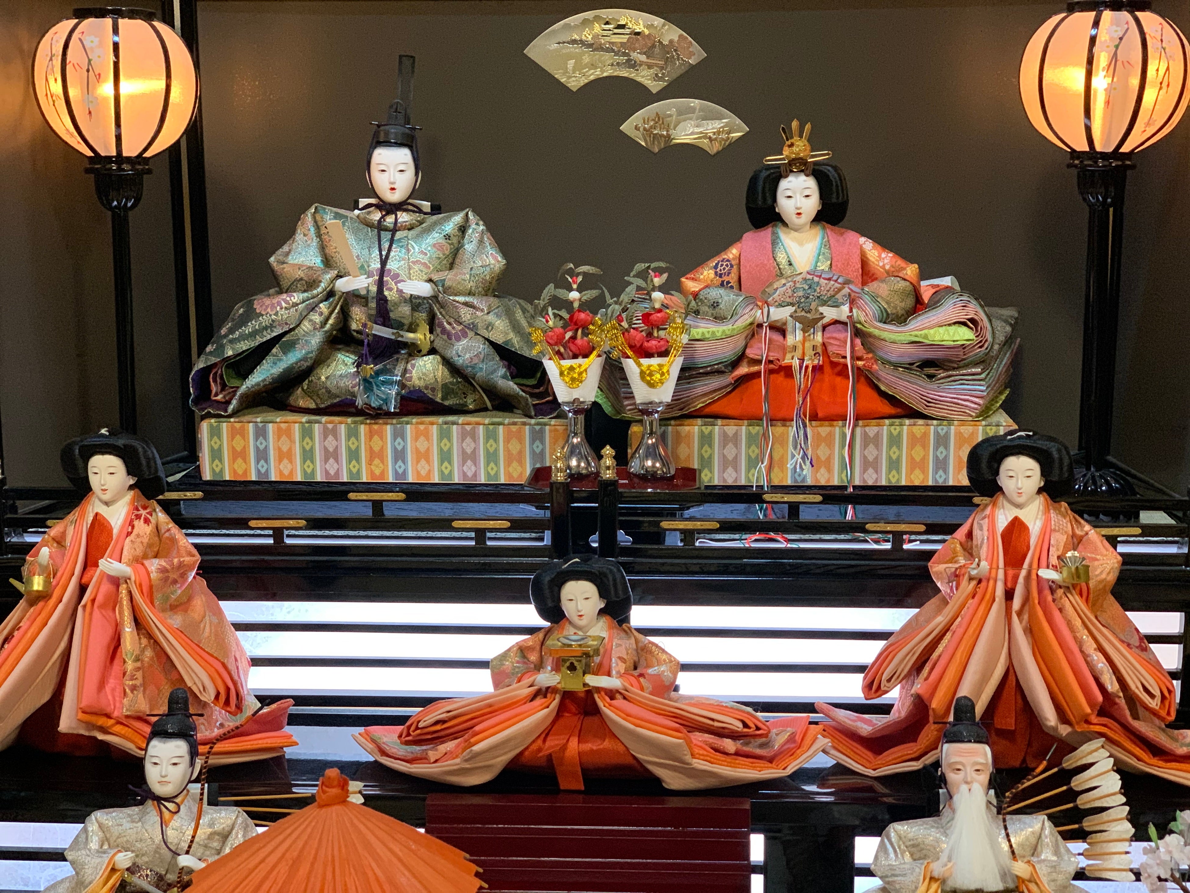 50年ものの段飾りを始め、優しいお顔の木目込み雛は五人囃子や三人官女、