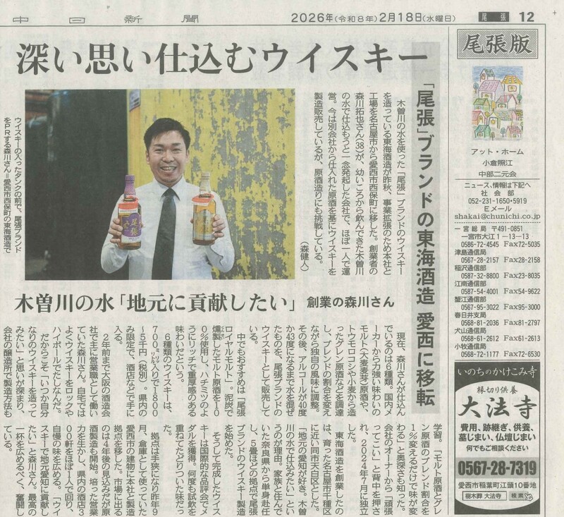 東海酒造株式会社(本社:愛知県愛西市、代表取締役:森川拓也)が製造・販売する愛知県限定ウイスキー「尾張」の取り組みが、2026年2月18日付の中日新聞に掲載されました。