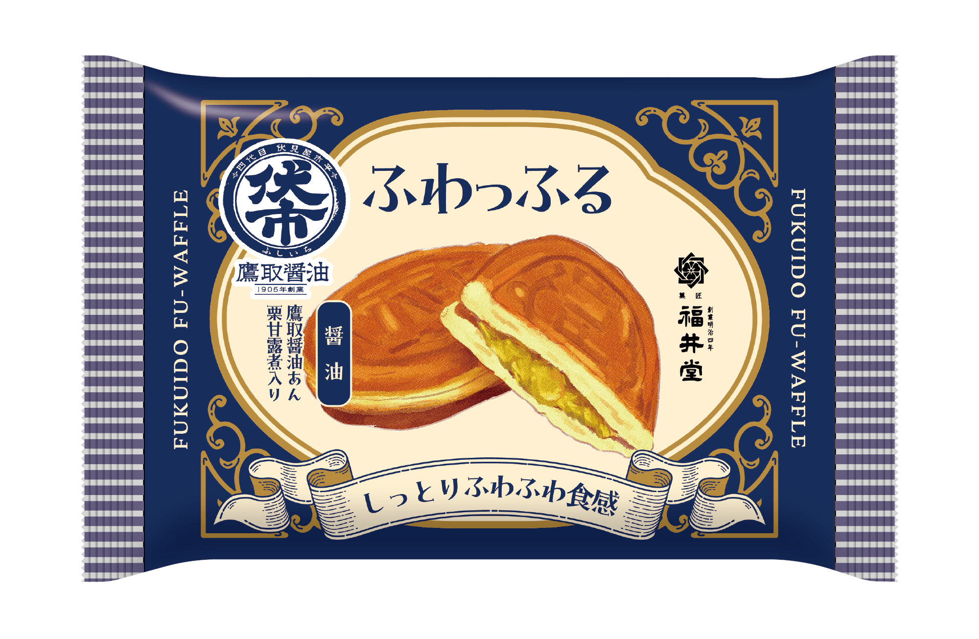 鷹取醤油の芳醇な風味をほんのり効かせた餡に、栗の甘露煮を練り込み、やさしい甘さとコク深い味わいに仕上げました。