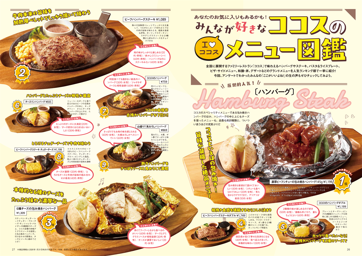 “ココロはずむココス”をテーマに専門店級の商品を手頃な価格で提供する「ココス」は、すべてのお客様が安全に、おいしく、そして手軽に食べられる商品を多彩なラインアップで提供しています。この度発売する『COCO’S LOVE BOOK』では、長年愛され続ける看板メニュー“包み焼きハンバーグ”のおいしさのヒミツをはじめ、ドリンクバーの新たな楽しみ方、ファミレスの常識を超えるココスのすごいトコ解説など、読むほどにココスが好きになるコンテンツを一冊に凝縮。ココスファンの方はもちろん、これまでココスをあまり知らなかった方にもお楽しみいただける一冊です。