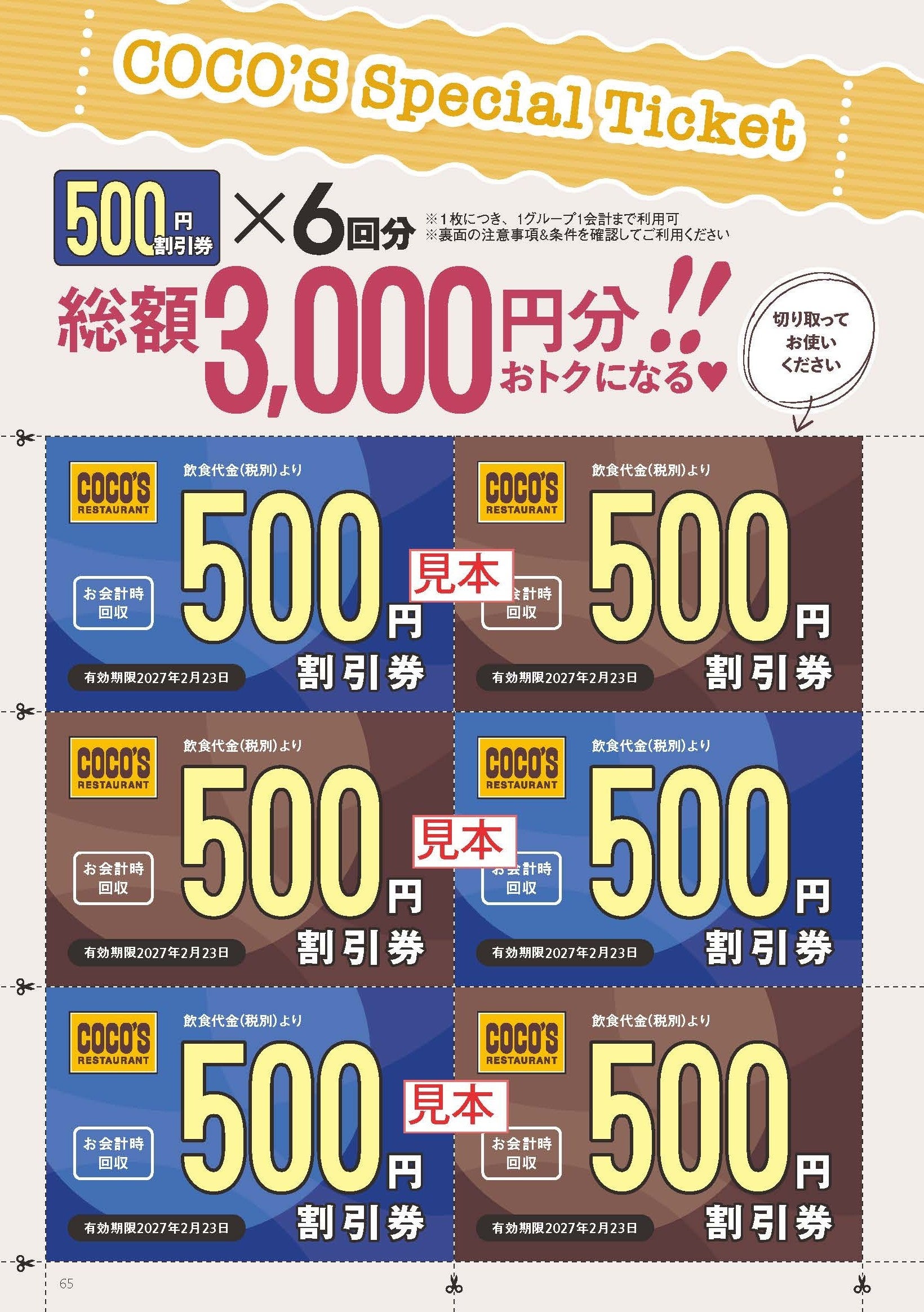 全国のココスで使える500円×6枚のお得な割引チケットです。