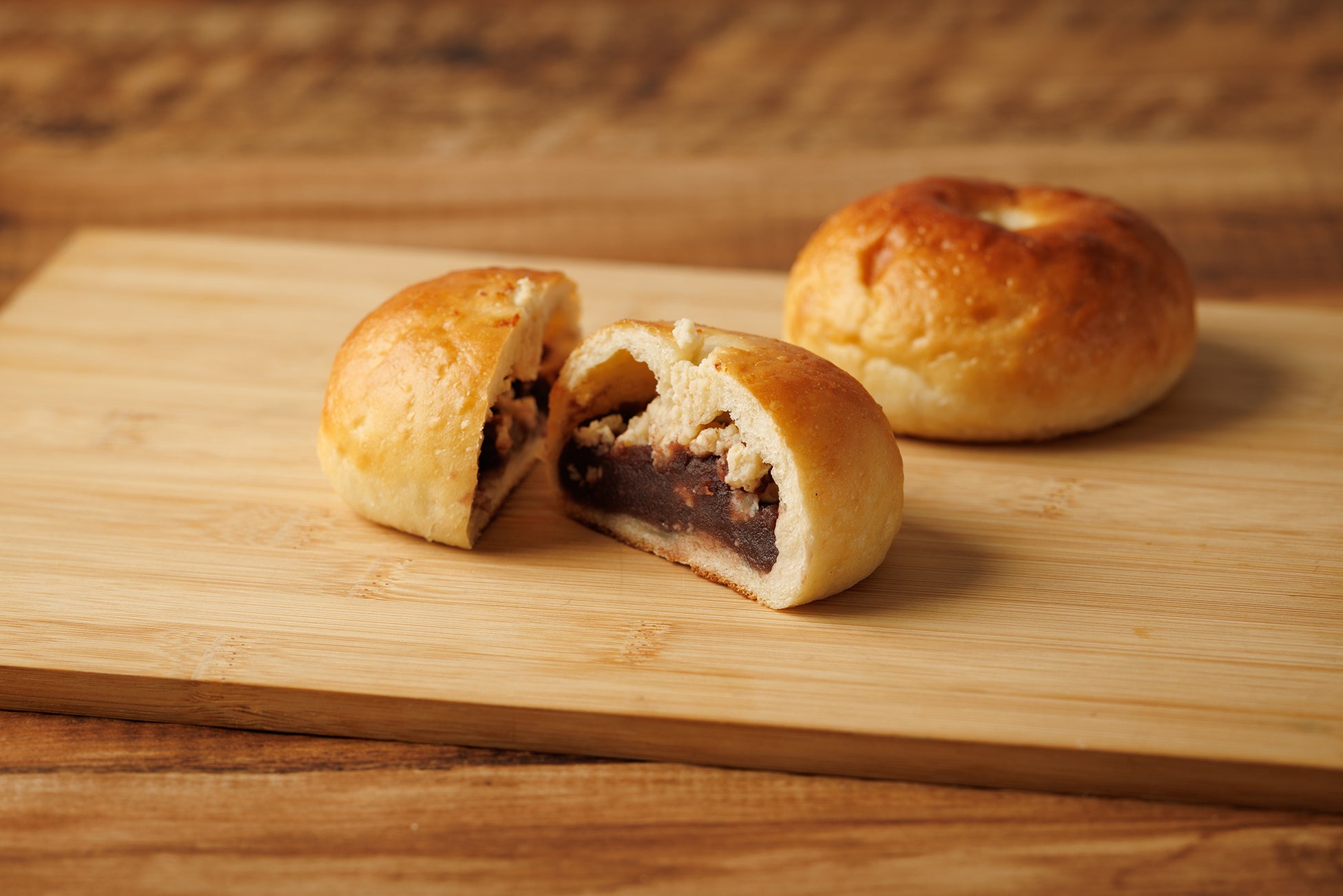 国産あずきを使った上品でなめらかなこしあんと、かごや商店の「流山本みりん」、そして本みりんを搾る際に生まれる幻の食材「こぼれ梅」を、湯種製法のもっちりとした生地で包みました。
