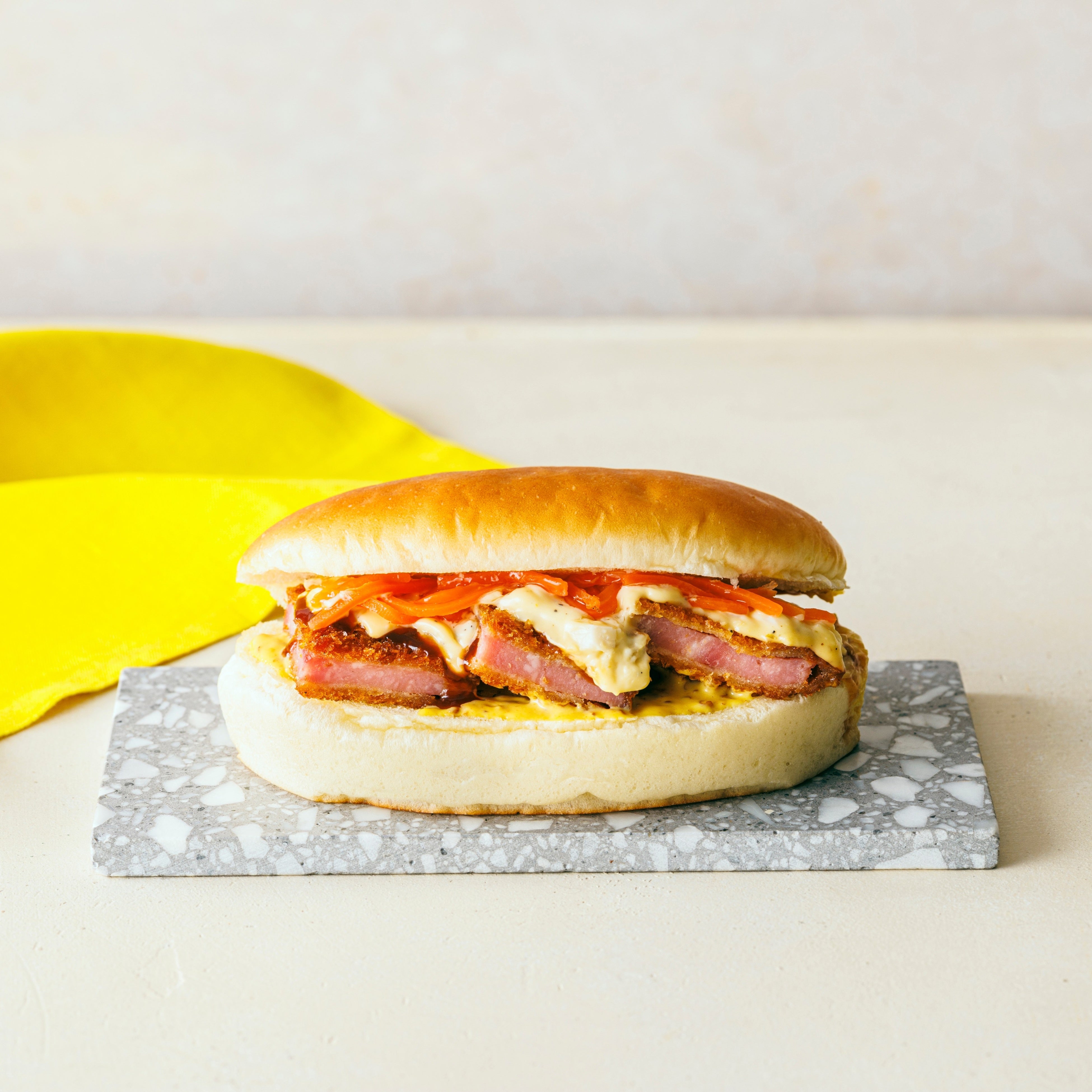 ハムカツにソース、タルタルソース、マスタードソース、キャロットラペを合わせたボリューミーで食べ応え抜群のハムカツサンドです。