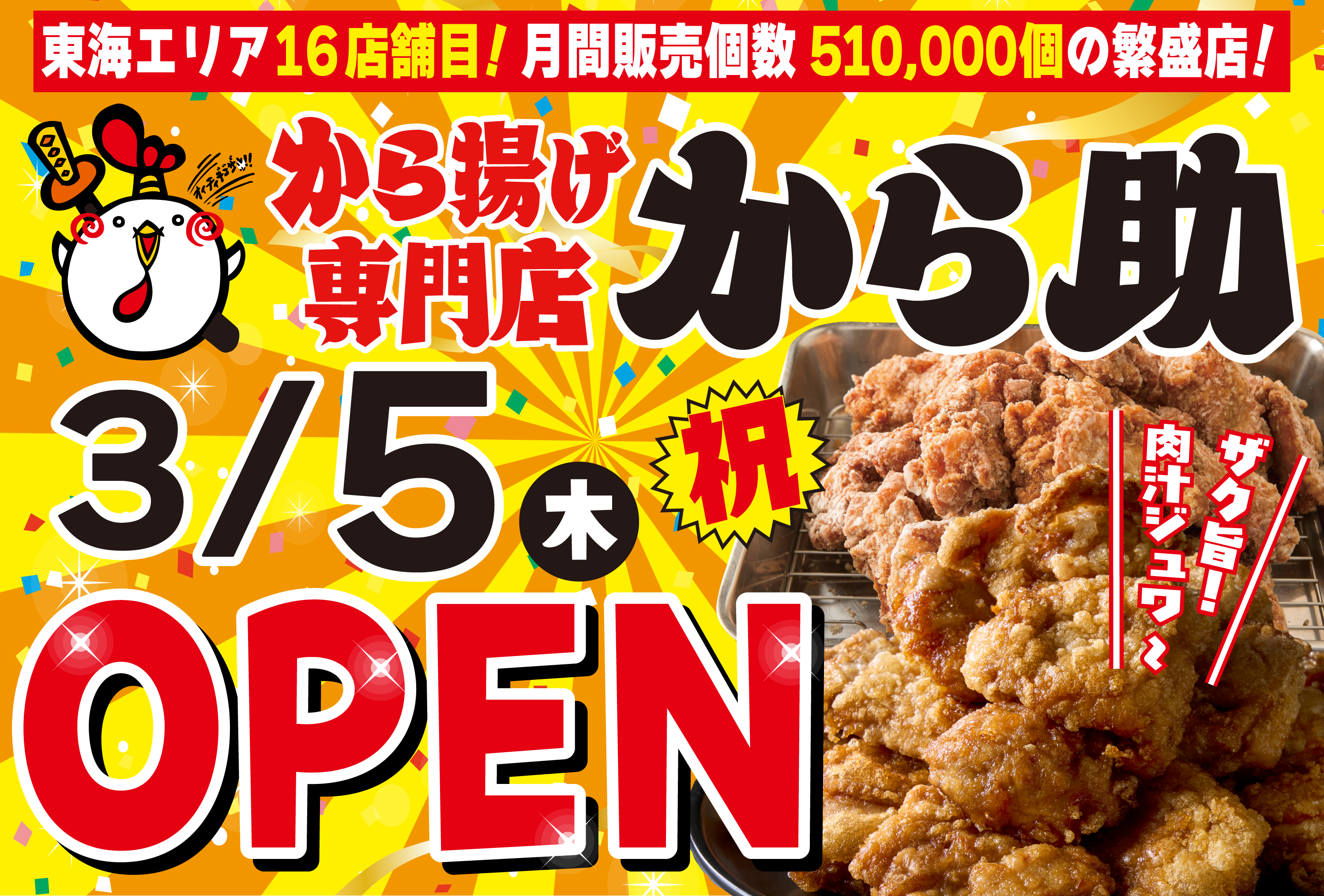 から揚げ専門店『から助』は、2026年3月5日(木)に愛知県名古屋市中川区に16店舗目となる『から揚げ専門店 から助 名古屋中川店』をオープンすることとなりました。