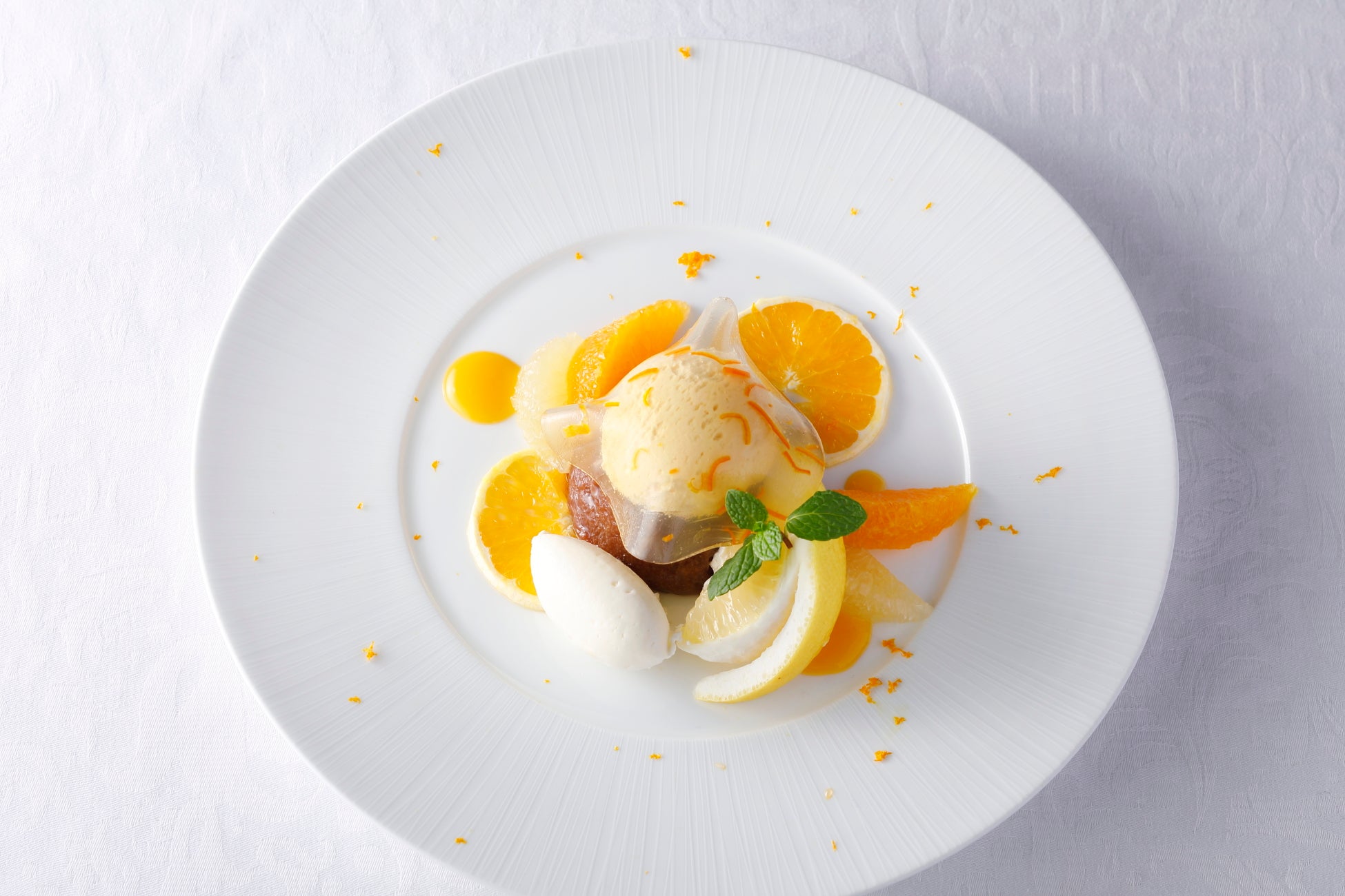 「旬の国産柑橘とショコラのサヴァラン 日向夏のシャーベットを添えて」