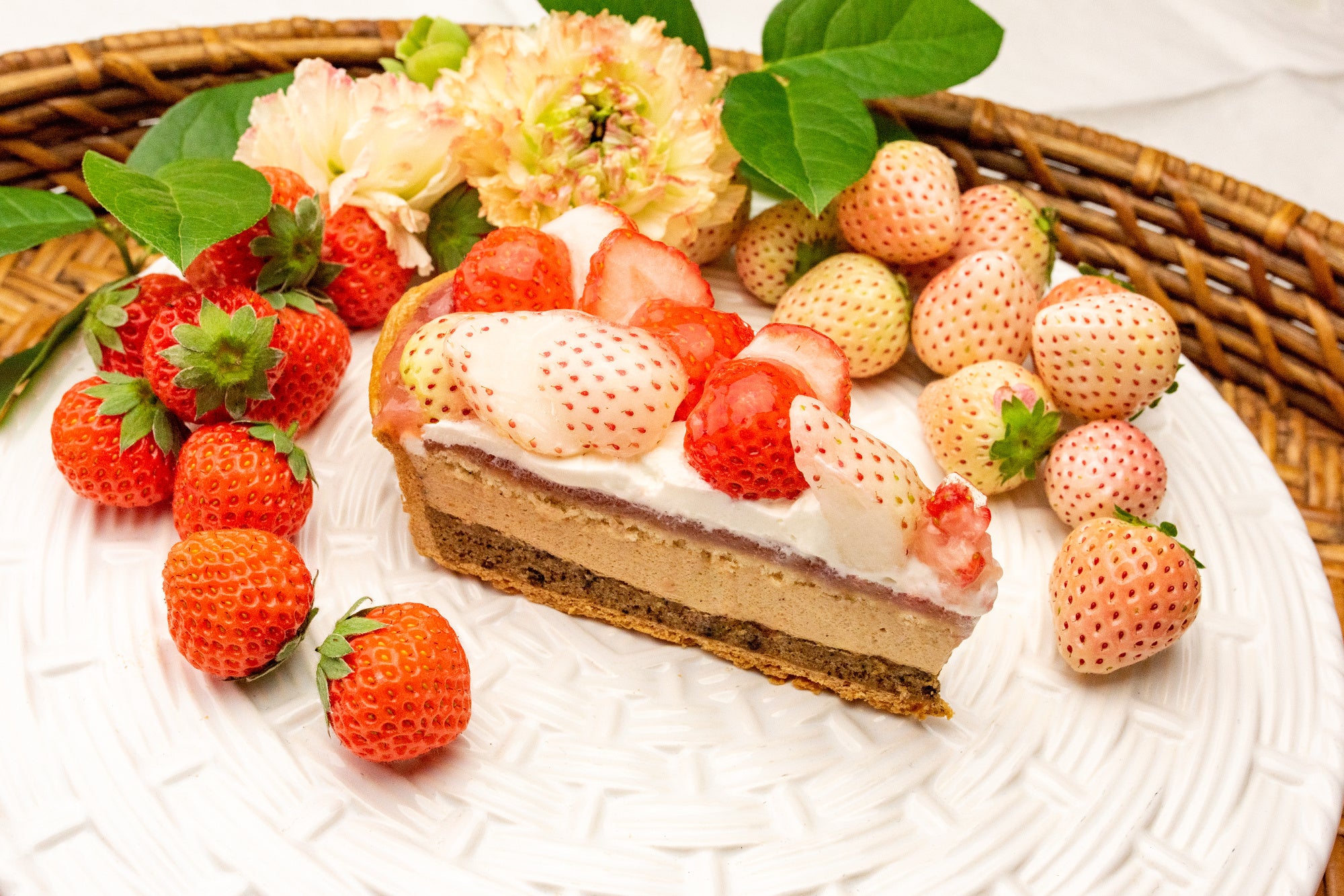 アッサムを合わせたアーモンドクリームにミルクティームースを流し、白イチゴ“初恋の香り”と“桃薫”を華やかに飾りました。2種類のブランドイチゴとミルクティーの組み合わせが新鮮です。