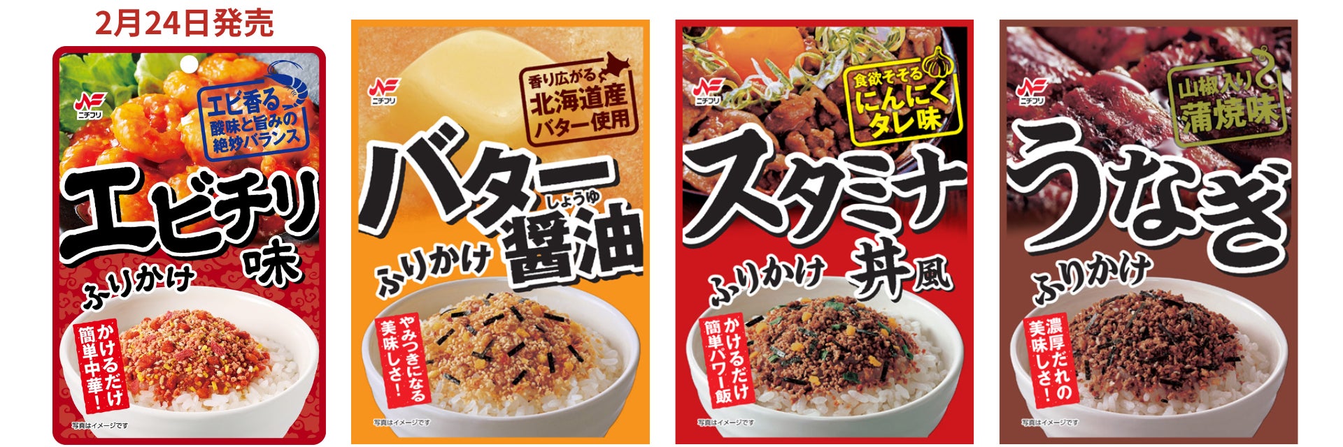 ニチフリ食品は、様々な味わいを“ふりかけで再現する”という独自のアプローチを強みに、長年にわたり多彩なラインアップを展開してまいりました。「バター醤油ふりかけ」をはじめとするニチフリの再現ふりかけシリーズに「エビチリ味」が新たに加わることで、さらに充実したラインアップへと進化いたします。シリーズ共通の世界観を持たせたパッケージは、味の特徴がひと目で伝わるデザインで統一されており、店頭でも高い訴求力を発揮します。