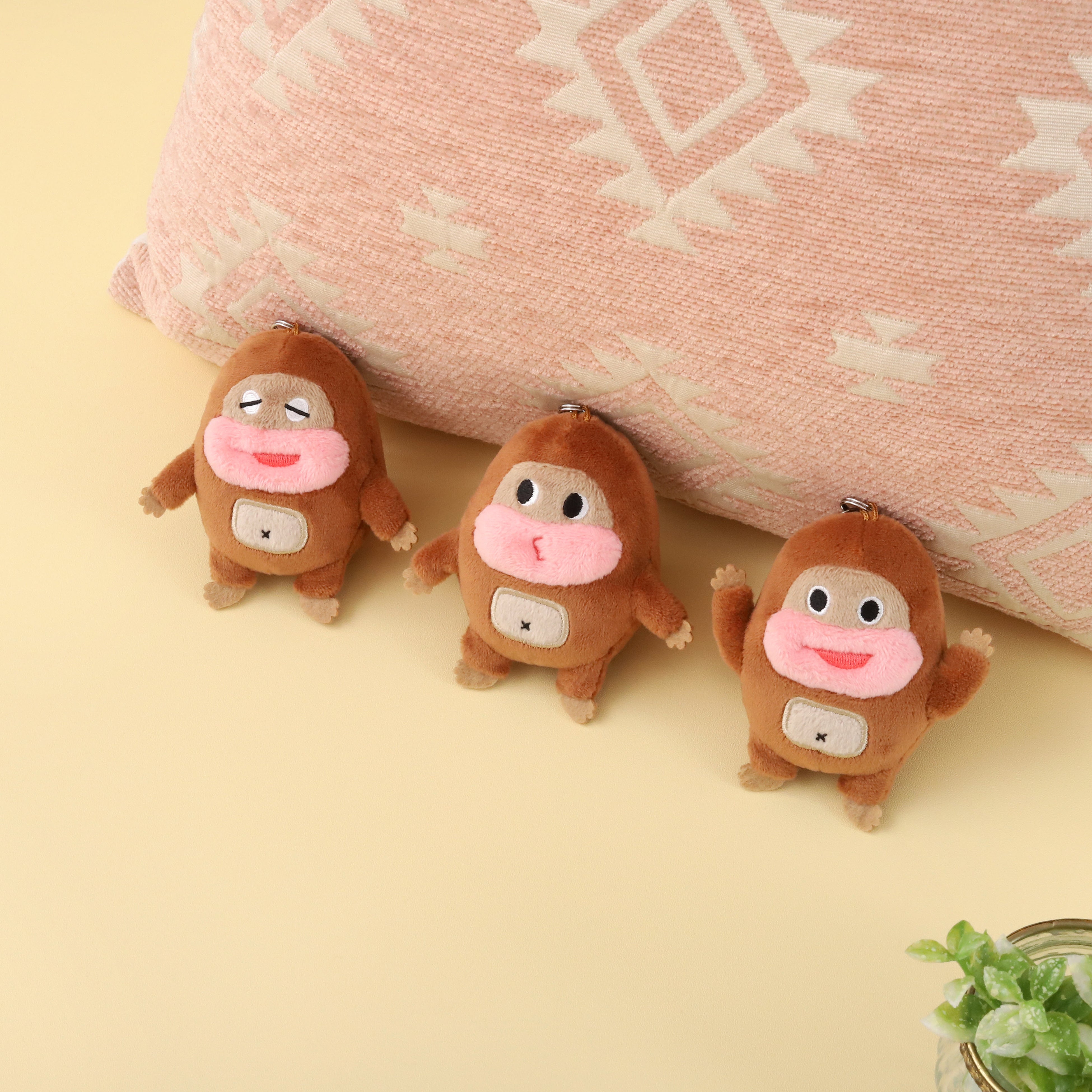 チョコ面とビスケット面のプリント文字まで再現した可愛いBIGチョコビスクッションに加え、ぬいぐるみマスコットチャームは表情違いの3種をご用意!小さめのサイズ感がとってもキュートです。