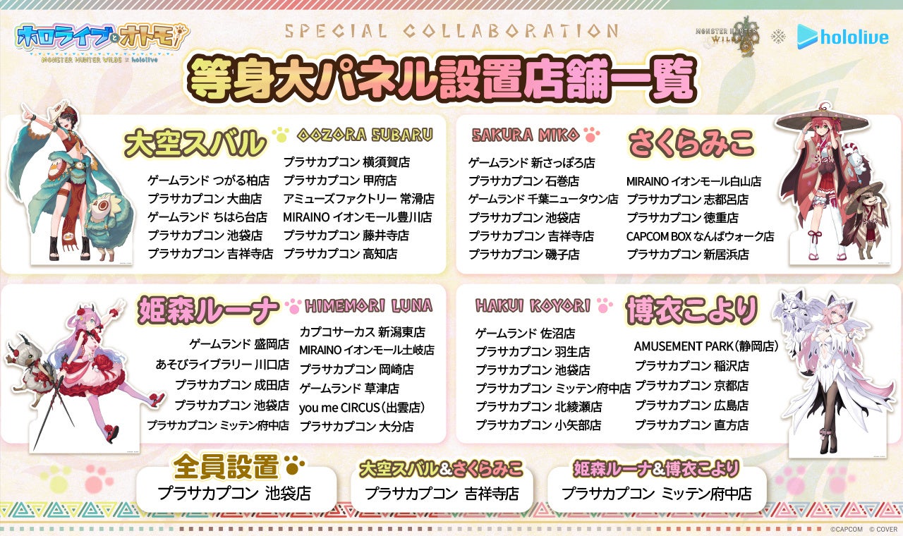 コラボ開始に合わせて、各店舗にて「モンスターハンターワイルズ×ホロライブ」コラボ第2弾のクレーンゲームが登場! さらに「プラサカプコン 池袋店」ではスペシャルコラボ店舗として特別装飾も展開。さらに等身大パネルも設置いたします。