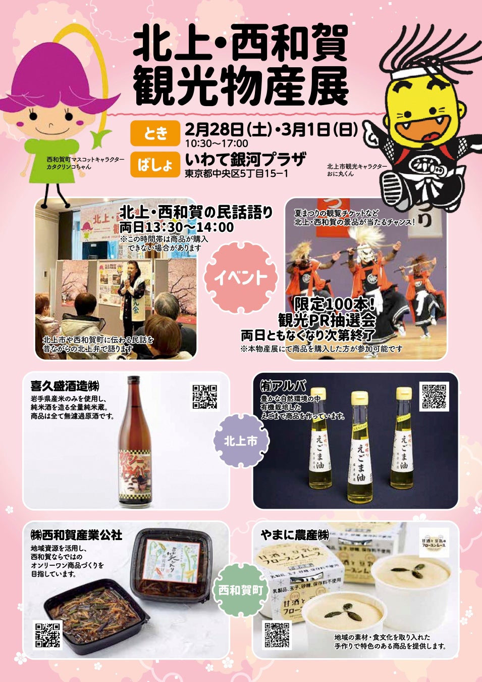内容:特産品販売、観光PR、民話語りイベント、抽選会など