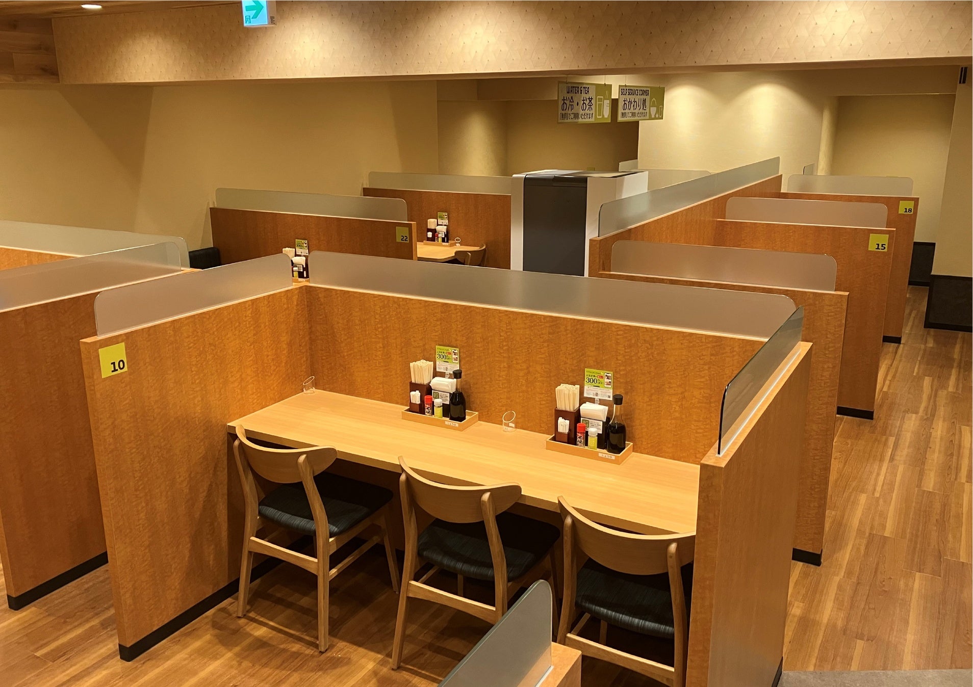 当店舗は2023年12月に公開しましたロゴ・シンボルマークなど新しいブランドイメージを表現した店舗となっております。ロゴ看板、モダンな“和”をイメージさせる暖簾(のれん)や「やよい軒」の名前のルーツでもある“彌生軒(やよいけん)”の歴史的資料をモチーフとした壁紙など、ブランドステートメントを表現する“上質な”イメージでデザインされた店舗です。 “ごはん”や“だし”、“漬け物”のおかわり自由が楽しめる『おかわり処』もございます。