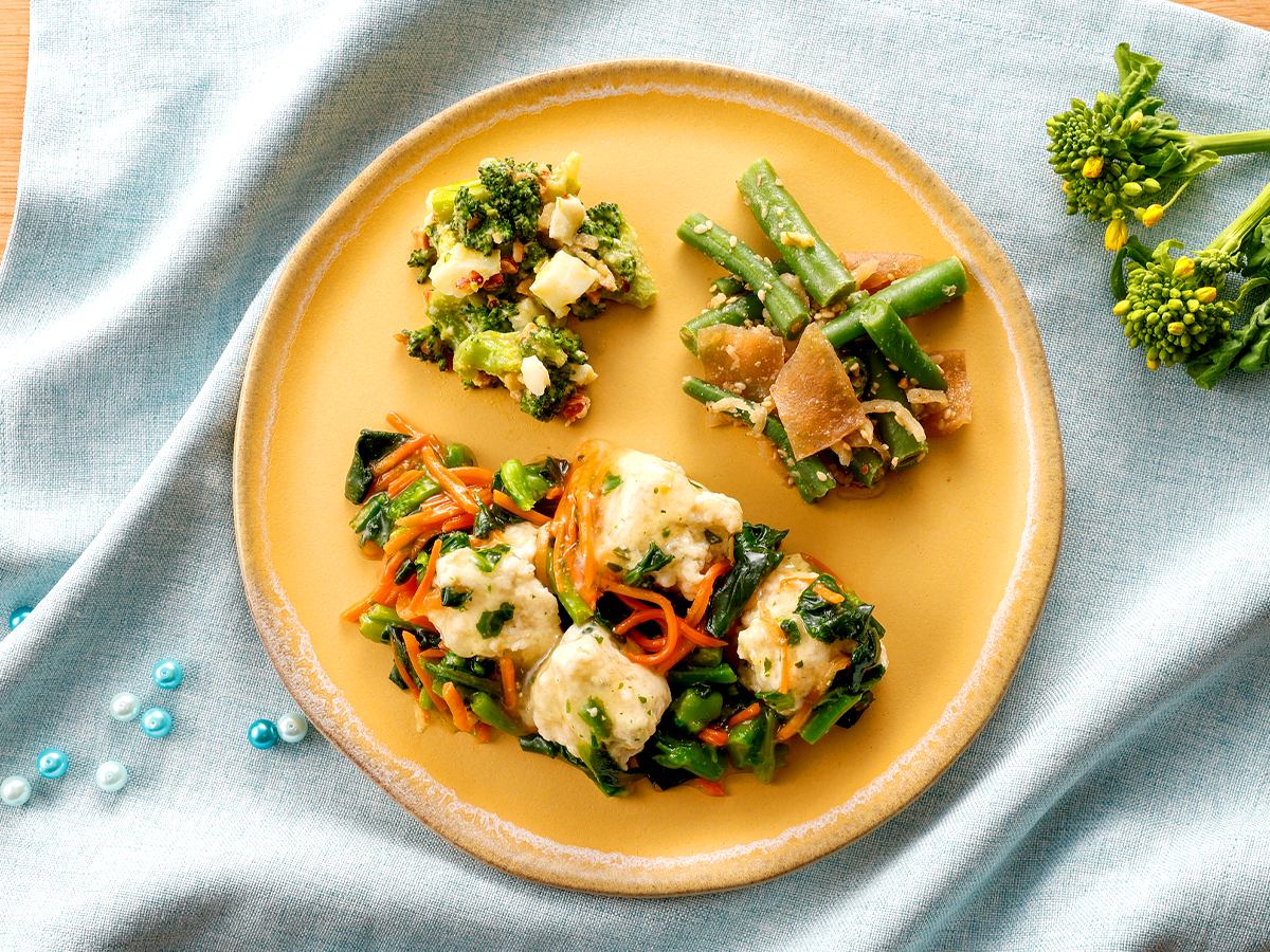 最大のポイントは、美味しさや栄養価基準はそのままに、「鯛つみれ」を1個増量。食べ応えを追求しつつ、出汁の味わいと生姜の爽やかな香りで、心も体も温まる一皿に仕上げました。また、添えられた菜の花や人参は、あんとの一体感を楽しめるよう、カットサイズや硬さを調整。一口ごとに旬の彩りと出汁の旨みが口いっぱいに広がります。