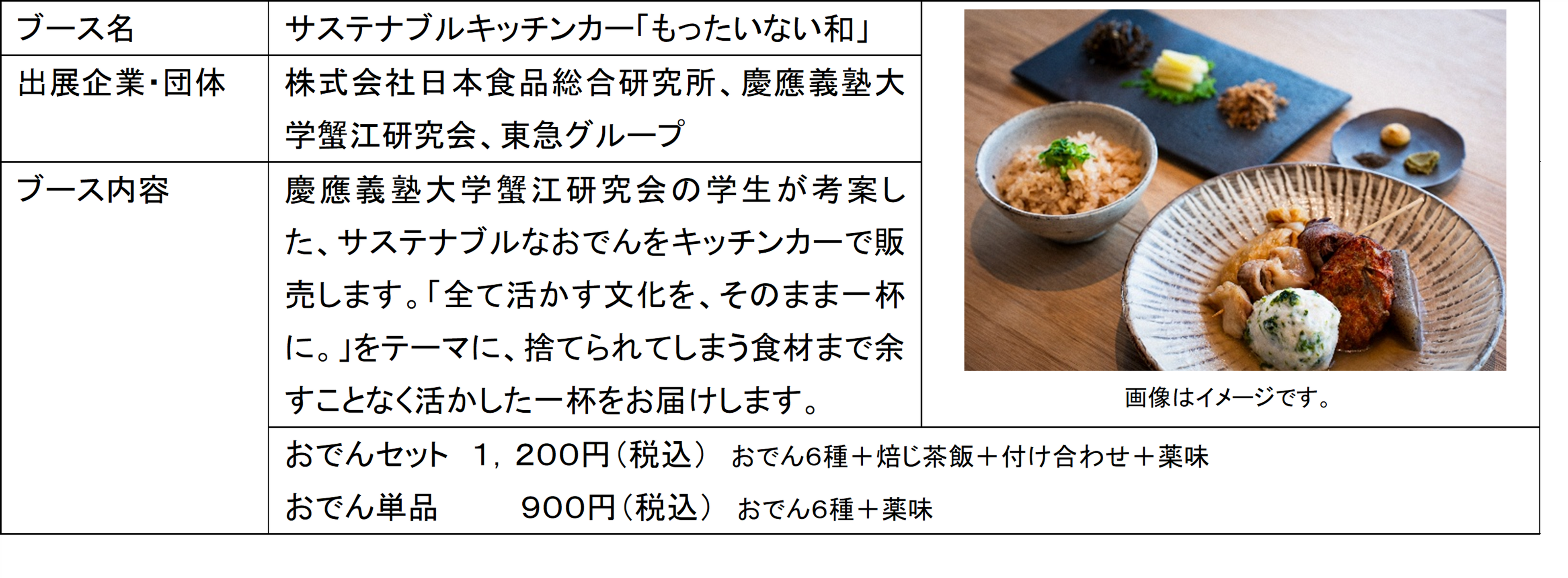 2024年、東急株式会社・東急不動産ホールディングス株式会社・慶應義塾大学蟹江研究会では共同プロジェクトとして、 広域渋谷圏の飲食店やホテル35店舗で「食のサステナビリティ共同調査」を実施しました。調査では、回答店舗の8割が「サステナビリティの取り組みをしたい意向がある」といった結果が出るなど、渋谷の飲食店におけるサステナビリティに関する現状やニーズが明らかになりました。2025度は第2弾の取り組みとして、SDGsを学ぶ蟹江研究会の学生が考案し、株式会社日本食品総合研究所がメニュー開発した「サステナブルなおでん」を、本イベントにてサステナブルキッチンカー「もったいない和」で販売、開催期間中は学生が購入者などに対して調査などを実施します。