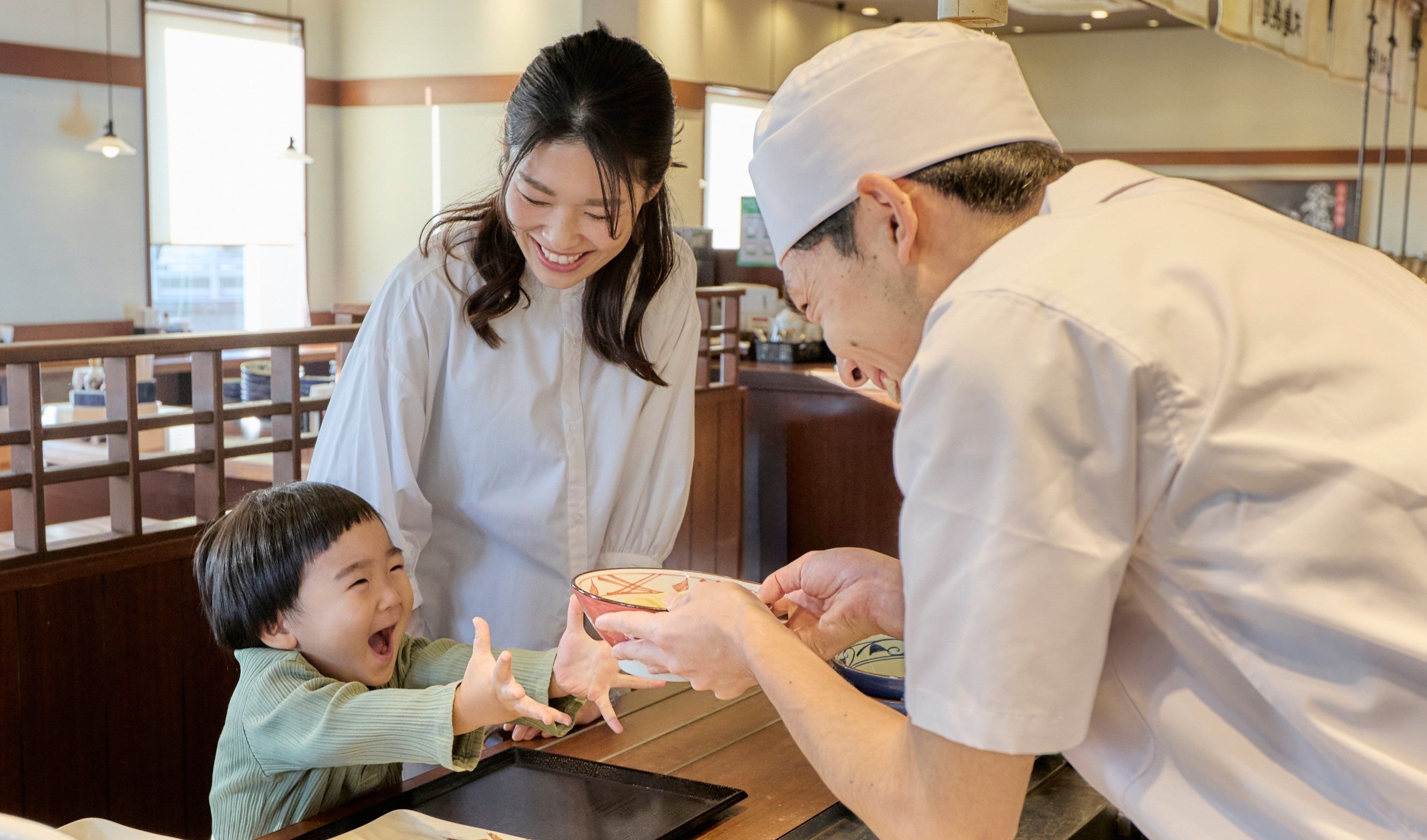 「心的資本経営」を推進する丸亀製麺では、これまでに、従来の店長制度を刷新し、新たに「ハピカンオフィサー制度」を導入、2025年11月に「ハピカンキャプテン」の認定式を行い、全国874店舗※の中から初代ハピカンキャプテンを選出・認定いたしました。また、1年に1度の大切な日に、家族や大切な人との温かい時間を従業員に過ごしてほしいという想いから、2025年12月24日にクリスマスイブのディナー営業を休業とした「丸亀ファミリーナイト」を実施。2026年2月より、従業員の中学3年生以下のお子さまの食事を会社がサポートする新たな福利厚生制度「家族食堂制度」を開始しました。従業員とその家族を支えることで、働く一人ひとりの幸福感を高め、その想いがお客さまへの感動体験として広がっていく好循環の起点となることを目指します。