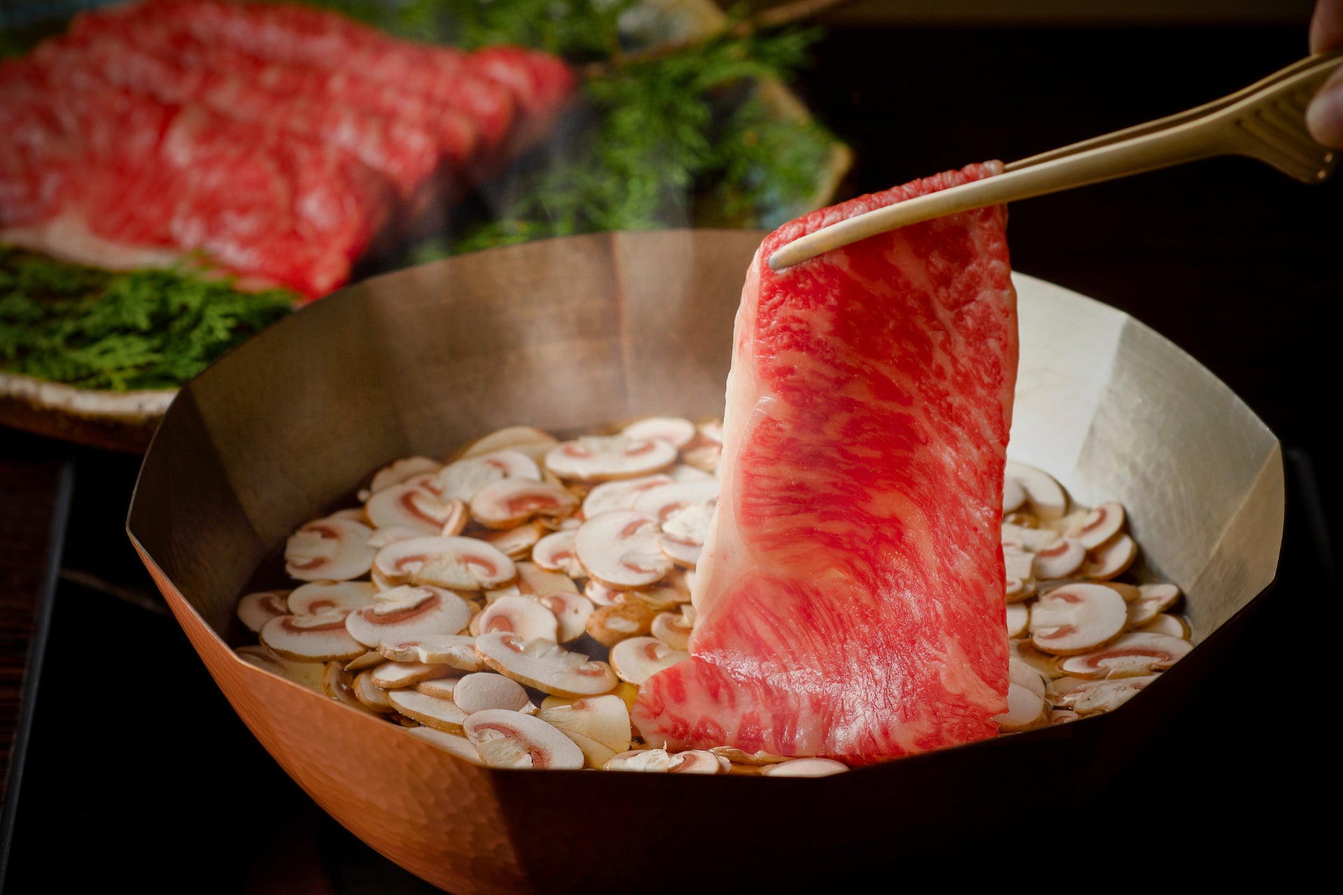 【お出汁を覆い尽くす有機マッシュルーム鍋の中で但馬玄をしゃぶしゃぶ】