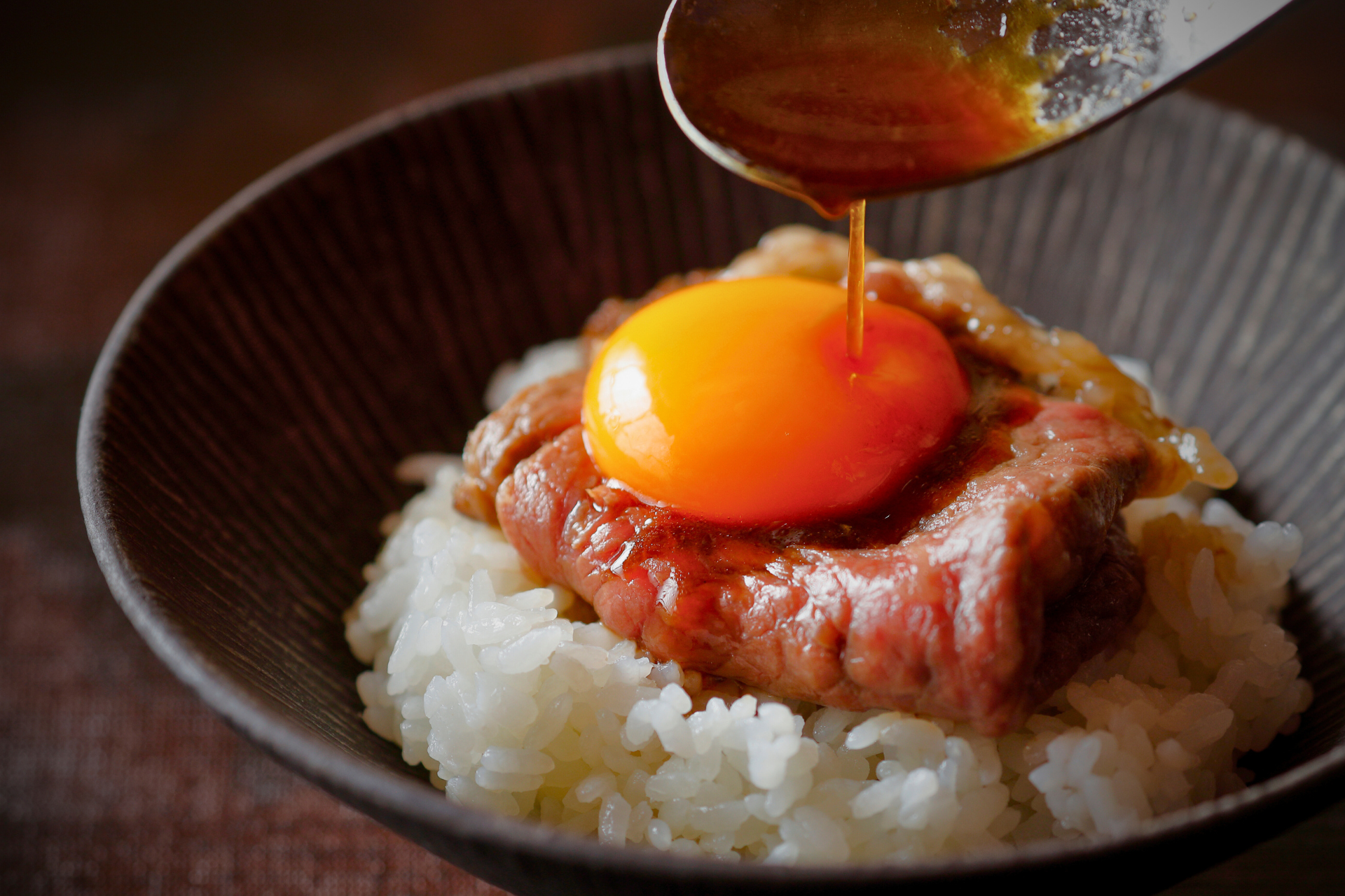 土鍋で炊き上げたお米の上に、贅沢な但馬玄と淡路島の黄身をのせて。