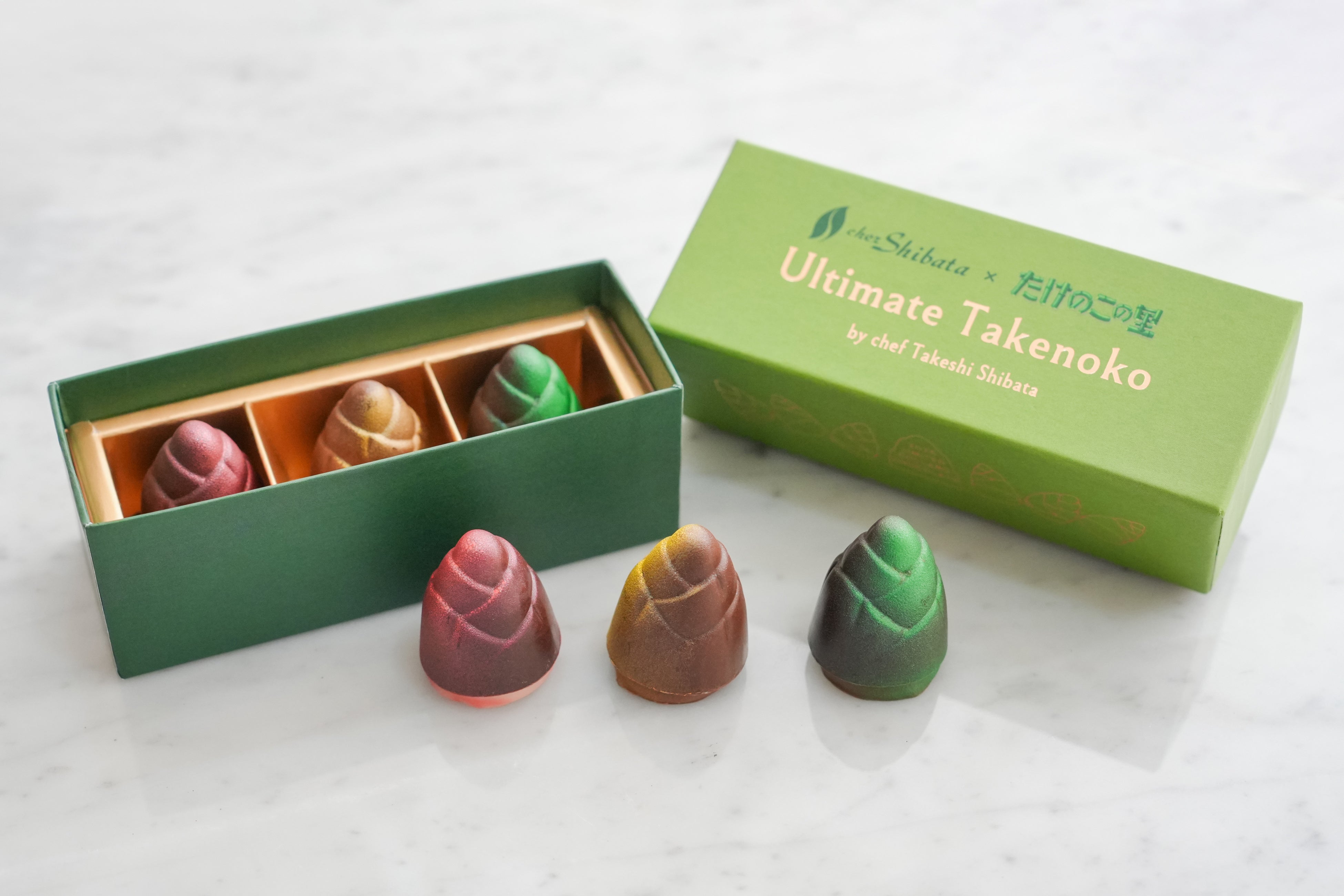 明治のロングセラー「たけのこの里」を、シェフ柴田が「究極(アルティメット)」をテーマに再構築。厳選された産地別カカオ豆を使用し、スパイスやお酒、岩塩を組み合わせた、大人向けの贅沢なボンボンショコラです。