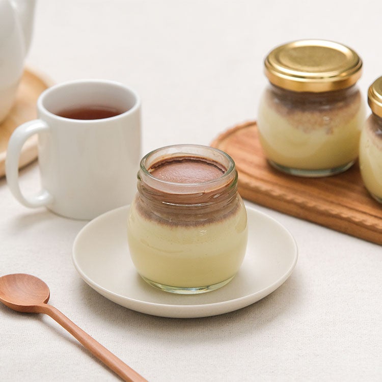 「卵と生クリームが生み出すなめらかな口どけと、きび糖のまろやかな甘さが調和した、やさしいプリンです。仕上げにかけたカカオソースのほろ苦さが、味わいにもうひとつの奥行きを加えています。」