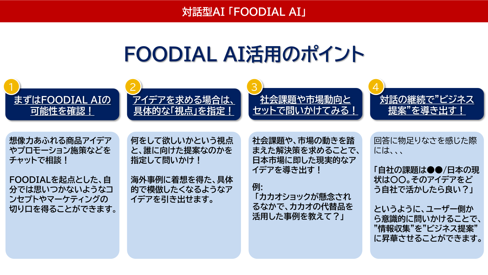 2025年のβ版公開時には、多くの食品・飲料メーカー様より「現地感のある回答」にご好評をいただいております。今回の正式版では、操作性と信頼性をブラッシュアップ。企業の「アイデア創出パートナー」として、さらなる進化を遂げました。