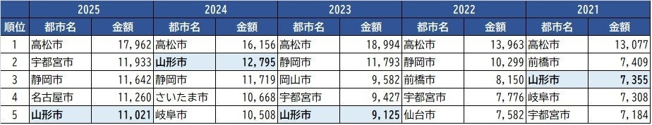 山形市は、総務省の家計調査における「中華そば(外食)の1世帯あたり支出額(単年)」で4年連続全国1位であり、市内には多様なラーメン文化が根付いています。