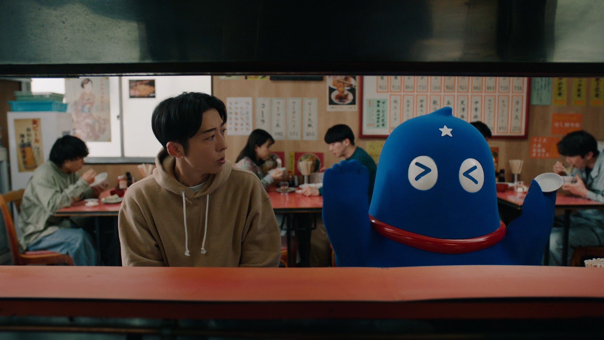 CMの見どころは、丸みを帯びた愛らしいフォルムのウミオスが、高橋さんと一緒にブランコに乗ったり、海辺の堤防や、中華料理店での餃子を前に「ウッス」と挨拶したりして距離を縮めていくユーモラスな姿など、思わず笑顔になるコミカルなシーンの数々です。「新生命体」として誕生したウミオスはまだ知らないコトがあるため、公園ではブランコに揺られてみたり、中華料理店ではお酢をそのまま舐めてしまうなど、好奇心旺盛に、様々なことへ挑戦していきます。その様子を見かねた高橋さんが優しく寄り添いながら教えてあげる仲睦まじい様子にも、是非ご注目ください。